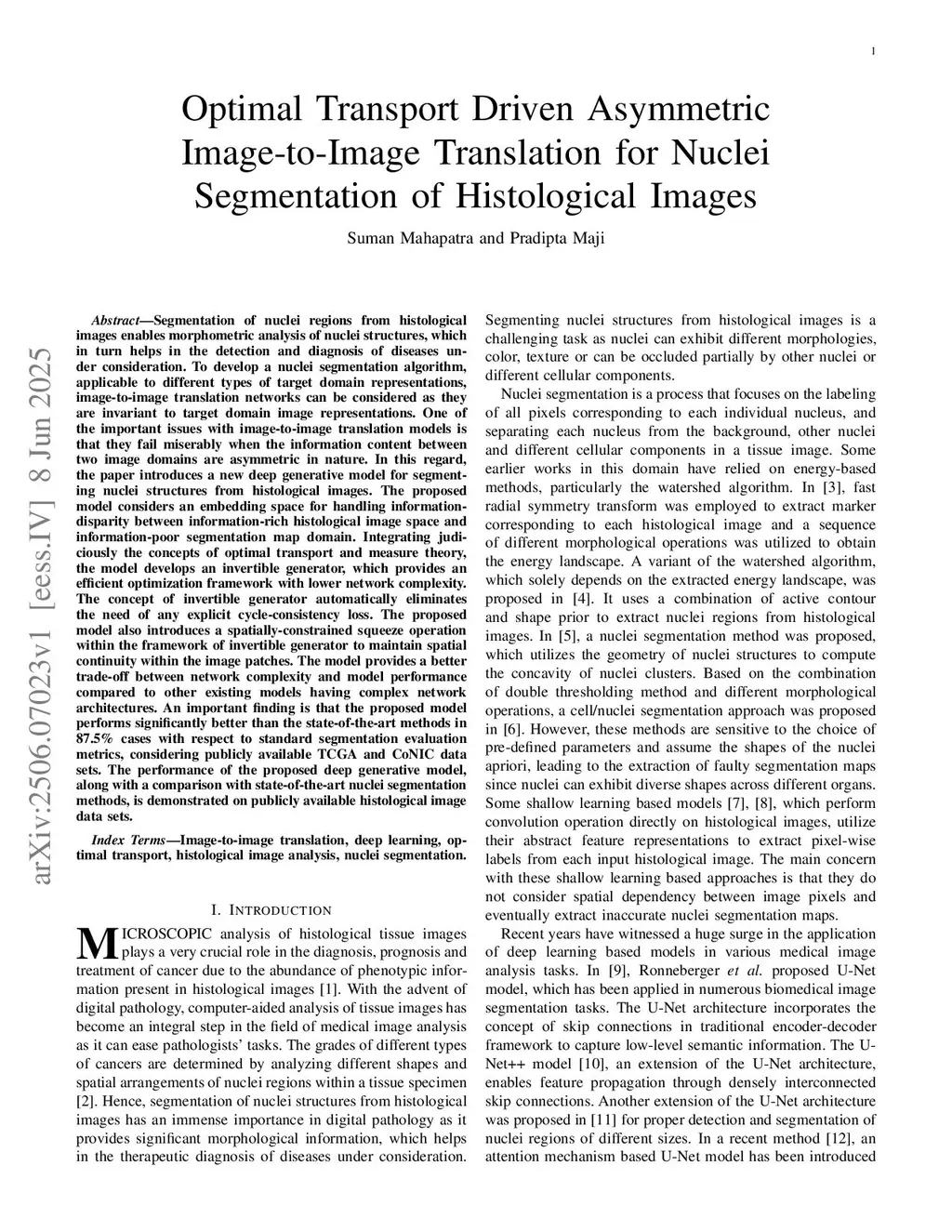 Segmentation of nuclei regions from histological images enables morphometric analysis of nuclei structures, which in turn helps in the detection and diagnosis of diseases under consideration. To develop a nuclei segmentation algorithm, applicable to different types of target domain representations, image-to-image translation networks can be considered as they are invariant to target domain image representations. One of the important issues with image-to-image translation models is that they fail miserably when the information content between two image domains are asymmetric in nature. In this regard, the paper introduces a new deep generative model for segmenting nuclei structures from histological images. The proposed model considers an embedding space for handling information-disparity between information-rich histological image space and information-poor segmentation map domain. Integrating judiciously the concepts of optimal transport and measure theory, the model develops an invertible generator, which provides an efficient optimization framework with lower network complexity. The concept of invertible generator automatically eliminates the need of any explicit cycle-consistency loss. The proposed model also introduces a spatially-constrained squeeze operation within the framework of invertible generator to maintain spatial continuity within the image patches. The model provides a better trade-off between network complexity and model performance compared to other existing models having complex network architectures. The performance of the proposed deep generative model, along with a comparison with state-of-the-art nuclei segmentation methods, is demonstrated on publicly available histological image data sets.