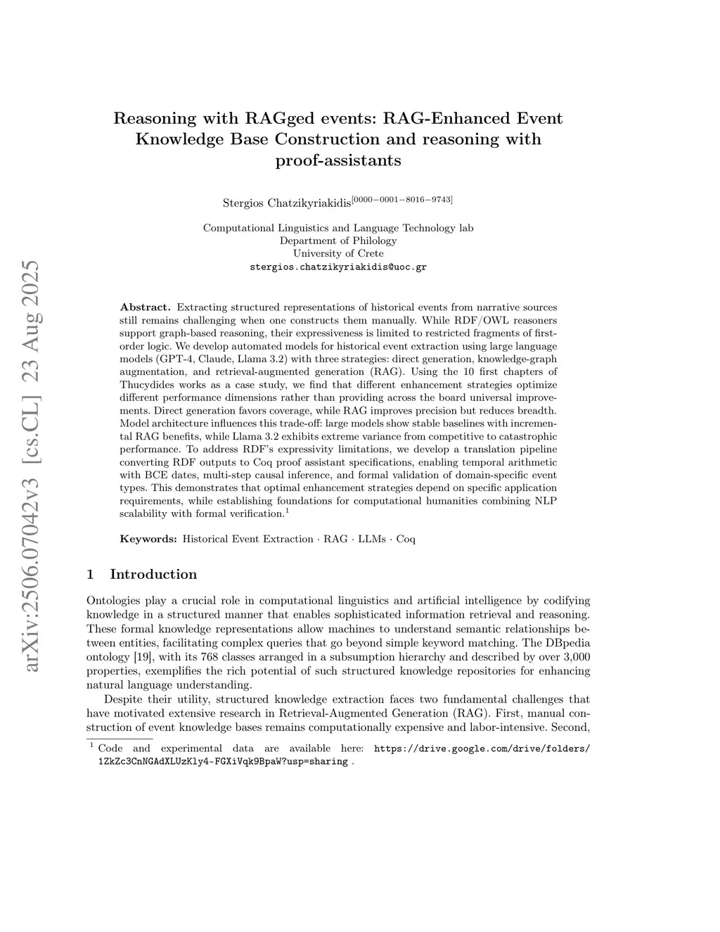 Extracting structured computational representations of historical events from narrative text remains computationally expensive when constructed manually. While RDF/OWL reasoners enable graph-based reasoning, they are limited to fragments of first-order logic, preventing deeper temporal and semantic analysis. This paper addresses both challenges by developing automatic historical event extraction models using multiple LLMs (GPT-4, Claude, Llama 3.2) with three enhancement strategies: pure base generation, knowledge graph enhancement, and Retrieval-Augmented Generation (RAG). We conducted comprehensive evaluations using historical texts from Thucydides. Our findings reveal that enhancement strategies optimize different performance dimensions rather than providing universal improvements. For coverage and historical breadth, base generation achieves optimal performance with Claude and GPT-4 extracting comprehensive events. However, for precision, RAG enhancement improves coordinate accuracy and metadata completeness. Model architecture fundamentally determines enhancement sensitivity: larger models demonstrate robust baseline performance with incremental RAG improvements, while Llama 3.2 shows extreme variance from competitive performance to complete failure. We then developed an automated translation pipeline converting extracted RDF representations into Coq proof assistant specifications, enabling higher-order reasoning beyond RDF capabilities including multi-step causal verification, temporal arithmetic with BC dates, and formal proofs about historical causation. The Coq formalization validates that RAG-discovered event types represent legitimate domain-specific semantic structures rather than ontological violations.