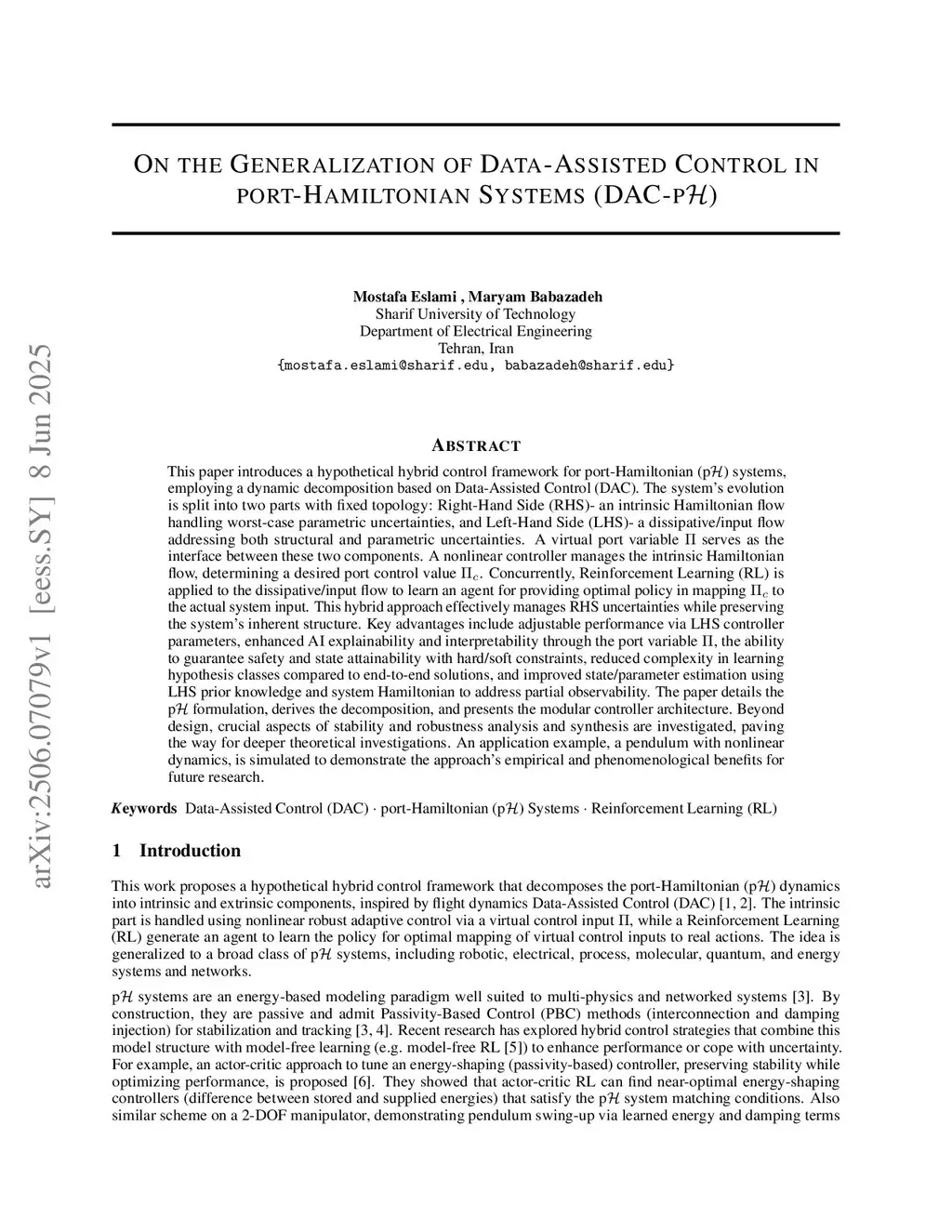 This paper introduces a hypothetical hybrid control framework for port-Hamiltonian (p) systems, employing a dynamic decomposition based on Data-Assisted Control (DAC). The system's evolution is split into two parts with fixed topology: Right-Hand Side (RHS)- an intrinsic Hamiltonian flow handling worst-case parametric uncertainties, and Left-Hand Side (LHS)- a dissipative/input flow addressing both structural and parametric uncertainties. A virtual port variable serves as the interface between these two components. A nonlinear controller manages the intrinsic Hamiltonian flow, determining a desired port control value . Concurrently, Reinforcement Learning (RL) is applied to the dissipative/input flow to learn an agent for providing optimal policy in mapping to the actual system input. This hybrid approach effectively manages RHS uncertainties while preserving the system's inherent structure. Key advantages include adjustable performance via LHS controller parameters, enhanced AI explainability and interpretability through the port variable , the ability to guarantee safety and state attainability with hard/soft constraints, reduced complexity in learning hypothesis classes compared to end-to-end solutions, and improved state/parameter estimation using LHS prior knowledge and system Hamiltonian to address partial observability. The paper details the p formulation, derives the decomposition, and presents the modular controller architecture. Beyond design, crucial aspects of stability and robustness analysis and synthesis are investigated, paving the way for deeper theoretical investigations. An application example, a pendulum with nonlinear dynamics, is simulated to demonstrate the approach's empirical and phenomenological benefits for future research.