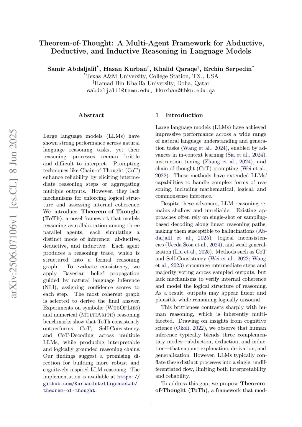 Large language models (LLMs) have shown strong performance across natural language reasoning tasks, yet their reasoning processes remain brittle and difficult to interpret. Prompting techniques like Chain-of-Thought (CoT) enhance reliability by eliciting intermediate reasoning steps or aggregating multiple outputs. However, they lack mechanisms for enforcing logical structure and assessing internal coherence. We introduce Theorem-of-Thought (ToTh), a novel framework that models reasoning as collaboration among three parallel agents, each simulating a distinct mode of inference: abductive, deductive, and inductive. Each agent produces a reasoning trace, which is structured into a formal reasoning graph. To evaluate consistency, we apply Bayesian belief propagation guided by natural language inference (NLI), assigning confidence scores to each step. The most coherent graph is selected to derive the final answer. Experiments on symbolic (WebOfLies) and numerical (MultiArith) reasoning benchmarks show that ToTh consistently outperforms CoT, Self-Consistency, and CoT-Decoding across multiple LLMs, while producing interpretable and logically grounded reasoning chains. Our findings suggest a promising direction for building more robust and cognitively inspired LLM reasoning. The implementation is available atthis https URL.