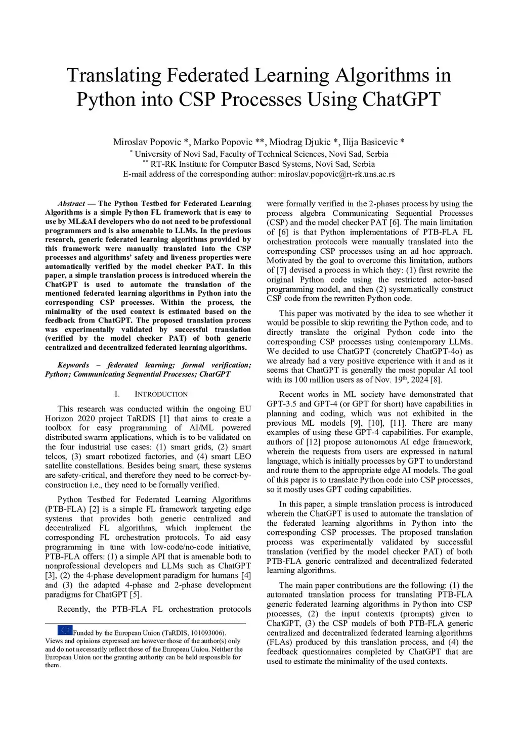 The Python Testbed for Federated Learning Algorithms is a simple Python FL framework that is easy to use by ML&AI developers who do not need to be professional programmers and is also amenable to LLMs. In the previous research, generic federated learning algorithms provided by this framework were manually translated into the CSP processes and algorithms' safety and liveness properties were automatically verified by the model checker PAT. In this paper, a simple translation process is introduced wherein the ChatGPT is used to automate the translation of the mentioned federated learning algorithms in Python into the corresponding CSP processes. Within the process, the minimality of the used context is estimated based on the feedback from ChatGPT. The proposed translation process was experimentally validated by successful translation (verified by the model checker PAT) of both generic centralized and decentralized federated learning algorithms.