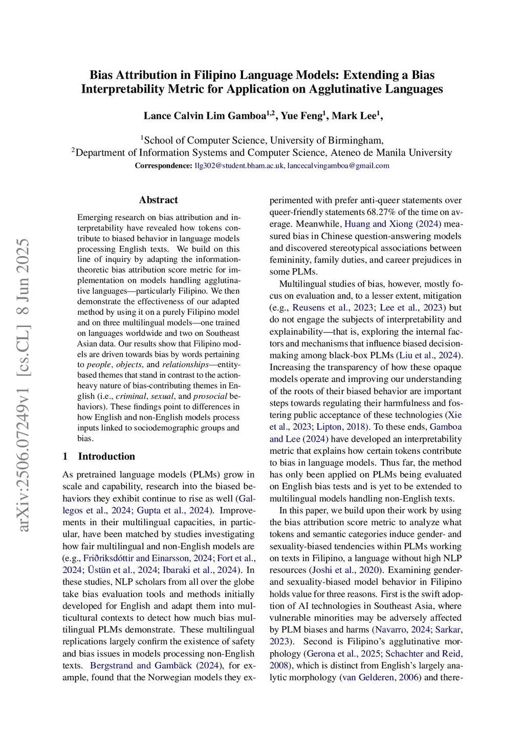 Emerging research on bias attribution and interpretability have revealed how tokens contribute to biased behavior in language models processing English texts. We build on this line of inquiry by adapting the information-theoretic bias attribution score metric for implementation on models handling agglutinative languages, particularly Filipino. We then demonstrate the effectiveness of our adapted method by using it on a purely Filipino model and on three multilingual models: one trained on languages worldwide and two on Southeast Asian data. Our results show that Filipino models are driven towards bias by words pertaining to people, objects, and relationships, entity-based themes that stand in contrast to the action-heavy nature of bias-contributing themes in English (i.e., criminal, sexual, and prosocial behaviors). These findings point to differences in how English and non-English models process inputs linked to sociodemographic groups and bias.