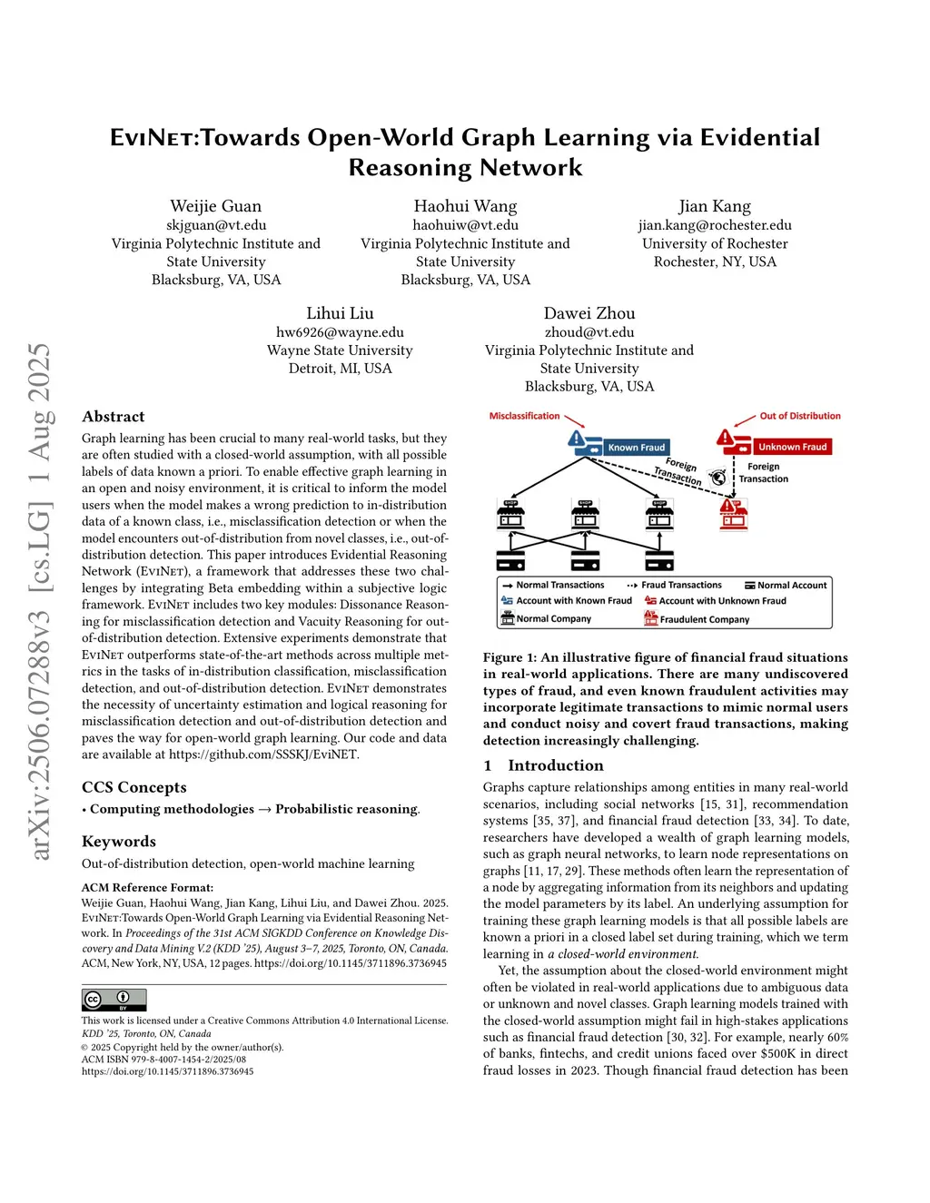 Graph learning has been crucial to many real-world tasks, but they are often studied with a closed-world assumption, with all possible labels of data known a priori. To enable effective graph learning in an open and noisy environment, it is critical to inform the model users when the model makes a wrong prediction to in-distribution data of a known class, i.e., misclassification detection or when the model encounters out-of-distribution from novel classes, i.e., out-of-distribution detection. This paper introduces Evidential Reasoning Network (EVINET), a framework that addresses these two challenges by integrating Beta embedding within a subjective logic framework. EVINET includes two key modules: Dissonance Reasoning for misclassification detection and Vacuity Reasoning for out-of-distribution detection. Extensive experiments demonstrate that EVINET outperforms state-of-the-art methods across multiple metrics in the tasks of in-distribution classification, misclassification detection, and out-of-distribution detection. EVINET demonstrates the necessity of uncertainty estimation and logical reasoning for misclassification detection and out-of-distribution detection and paves the way for open-world graph learning. Our code and data are available atthis https URL.