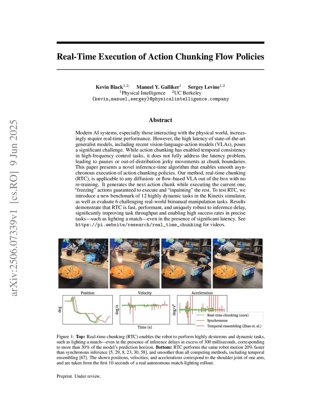 Modern AI systems, especially those interacting with the physical world, increasingly require real-time performance. However, the high latency of state-of-the-art generalist models, including recent vision-language action models (VLAs), poses a significant challenge. While action chunking has enabled temporal consistency in high-frequency control tasks, it does not fully address the latency problem, leading to pauses or out-of-distribution jerky movements at chunk boundaries. This paper presents a novel inference-time algorithm that enables smooth asynchronous execution of action chunking policies. Our method, real-time chunking (RTC), is applicable to any diffusion- or flow-based VLA out of the box with no re-training. It generates the next action chunk while executing the current one, "freezing" actions guaranteed to execute and "inpainting" the rest. To test RTC, we introduce a new benchmark of 12 highly dynamic tasks in the Kinetix simulator, as well as evaluate 6 challenging real-world bimanual manipulation tasks. Results demonstrate that RTC is fast, performant, and uniquely robust to inference delay, significantly improving task throughput and enabling high success rates in precise tasks such as lighting a match even in the presence of significant latency. Seethis https URLfor videos.