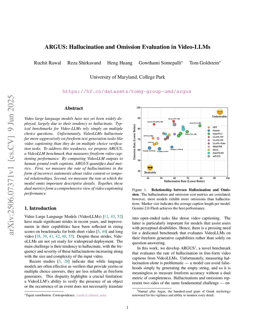 Video large language models have not yet been widely deployed, largely due to their tendency to hallucinate. Typical benchmarks for Video-LLMs rely simply on multiple-choice questions. Unfortunately, VideoLLMs hallucinate far more aggressively on freeform text generation tasks like video captioning than they do on multiple choice verification tasks. To address this weakness, we propose ARGUS, a VideoLLM benchmark that measures freeform video captioning performance. By comparing VideoLLM outputs to human ground truth captions, ARGUS quantifies dual metrics. First, we measure the rate of hallucinations in the form of incorrect statements about video content or temporal relationships. Second, we measure the rate at which the model omits important descriptive details. Together, these dual metrics form a comprehensive view of video captioning performance.