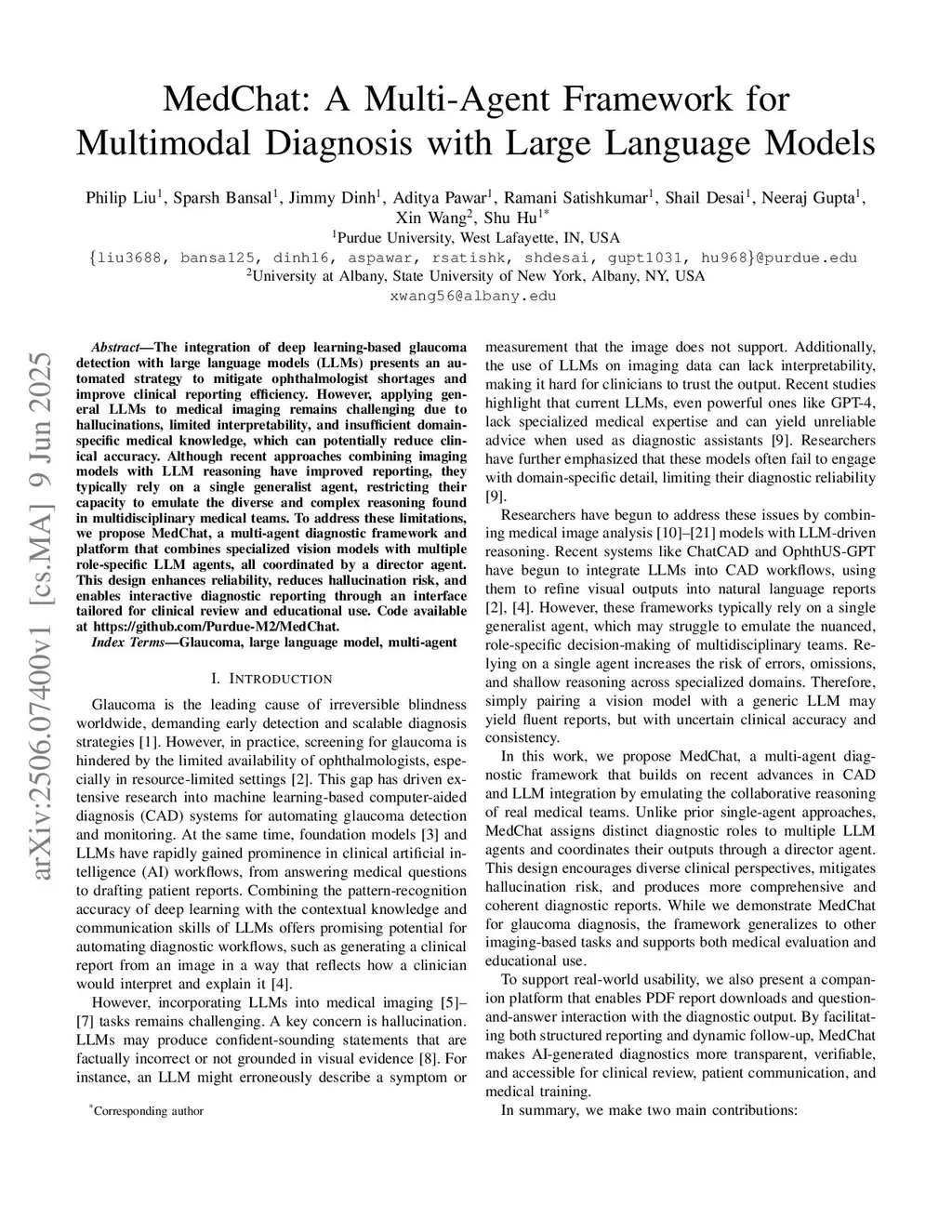 The integration of deep learning-based glaucoma detection with large language models (LLMs) presents an automated strategy to mitigate ophthalmologist shortages and improve clinical reporting efficiency. However, applying general LLMs to medical imaging remains challenging due to hallucinations, limited interpretability, and insufficient domain-specific medical knowledge, which can potentially reduce clinical accuracy. Although recent approaches combining imaging models with LLM reasoning have improved reporting, they typically rely on a single generalist agent, restricting their capacity to emulate the diverse and complex reasoning found in multidisciplinary medical teams. To address these limitations, we propose MedChat, a multi-agent diagnostic framework and platform that combines specialized vision models with multiple role-specific LLM agents, all coordinated by a director agent. This design enhances reliability, reduces hallucination risk, and enables interactive diagnostic reporting through an interface tailored for clinical review and educational use. Code available atthis https URL.