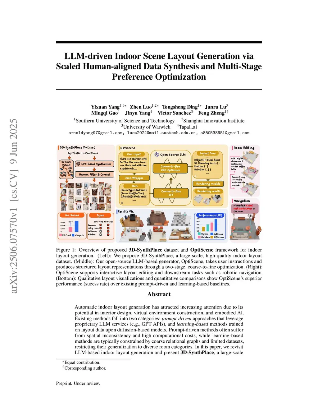 Automatic indoor layout generation has attracted increasing attention due to its potential in interior design, virtual environment construction, and embodied AI. Existing methods fall into two categories: prompt-driven approaches that leverage proprietary LLM services (e.g., GPT APIs) and learning-based methods trained on layout data upon diffusion-based models. Prompt-driven methods often suffer from spatial inconsistency and high computational costs, while learning-based methods are typically constrained by coarse relational graphs and limited datasets, restricting their generalization to diverse room categories. In this paper, we revisit LLM-based indoor layout generation and present 3D-SynthPlace, a large-scale dataset that combines synthetic layouts generated via a 'GPT synthesize, Human inspect' pipeline, upgraded from the 3D-Front dataset. 3D-SynthPlace contains nearly 17,000 scenes, covering four common room types -- bedroom, living room, kitchen, and bathroom -- enriched with diverse objects and high-level spatial annotations. We further introduce OptiScene, a strong open-source LLM optimized for indoor layout generation, fine-tuned based on our 3D-SynthPlace dataset through our two-stage training. For the warum-up stage I, we adopt supervised fine-tuning (SFT), which is taught to first generate high-level spatial descriptions then conditionally predict concrete object placements. For the reinforcing stage II, to better align the generated layouts with human design preferences, we apply multi-turn direct preference optimization (DPO), which significantly improving layout quality and generation success rates. Extensive experiments demonstrate that OptiScene outperforms traditional prompt-driven and learning-based baselines. Moreover, OptiScene shows promising potential in interactive tasks such as scene editing and robot navigation.
