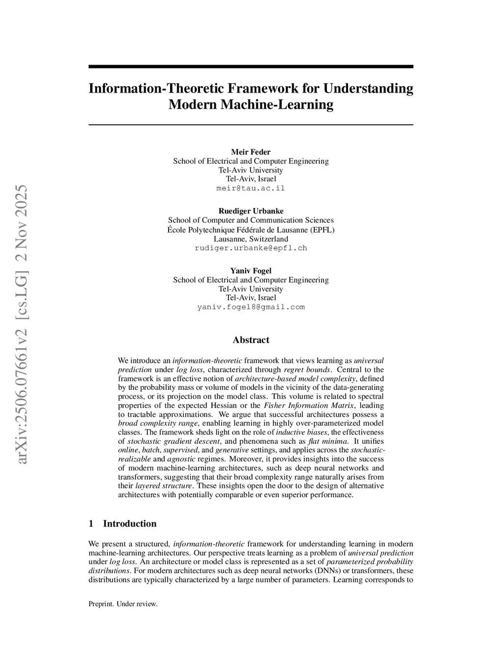 We introduce an information-theoretic framework that views learning as universal prediction under log loss, characterized through regret bounds. Central to the framework is an effective notion of architecture-based model complexity, defined by the probability mass or volume of models in the vicinity of the data-generating process, or its projection on the model class. This volume is related to spectral properties of the expected Hessian or the Fisher Information Matrix, leading to tractable approximations. We argue that successful architectures possess a broad complexity range, enabling learning in highly over-parameterized model classes. The framework sheds light on the role of inductive biases, the effectiveness of stochastic gradient descent, and phenomena such as flat minima. It unifies online, batch, supervised, and generative settings, and applies across the stochastic-realizable and agnostic regimes. Moreover, it provides insights into the success of modern machine-learning architectures, such as deep neural networks and transformers, suggesting that their broad complexity range naturally arises from their layered structure. These insights open the door to the design of alternative architectures with potentially comparable or even superior performance.