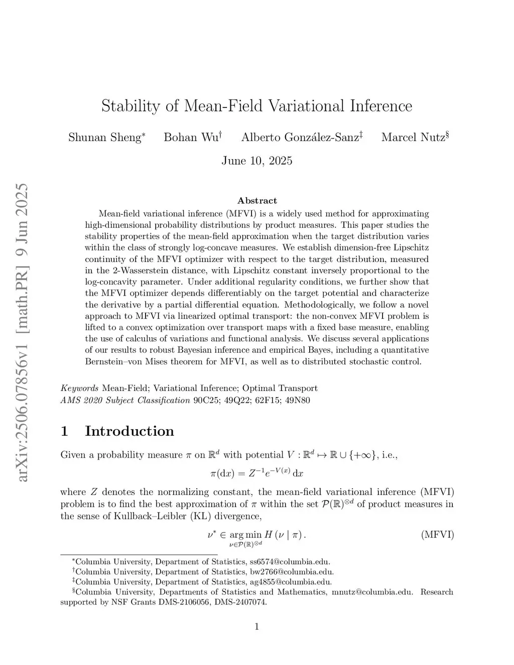 Mean-field variational inference (MFVI) is a widely used method for approximating high-dimensional probability distributions by product measures. This paper studies the stability properties of the mean-field approximation when the target distribution varies within the class of strongly log-concave measures. We establish dimension-free Lipschitz continuity of the MFVI optimizer with respect to the target distribution, measured in the 2-Wasserstein distance, with Lipschitz constant inversely proportional to the log-concavity parameter. Under additional regularity conditions, we further show that the MFVI optimizer depends differentiably on the target potential and characterize the derivative by a partial differential equation. Methodologically, we follow a novel approach to MFVI via linearized optimal transport: the non-convex MFVI problem is lifted to a convex optimization over transport maps with a fixed base measure, enabling the use of calculus of variations and functional analysis. We discuss several applications of our results to robust Bayesian inference and empirical Bayes, including a quantitative Bernstein--von Mises theorem for MFVI, as well as to distributed stochastic control.