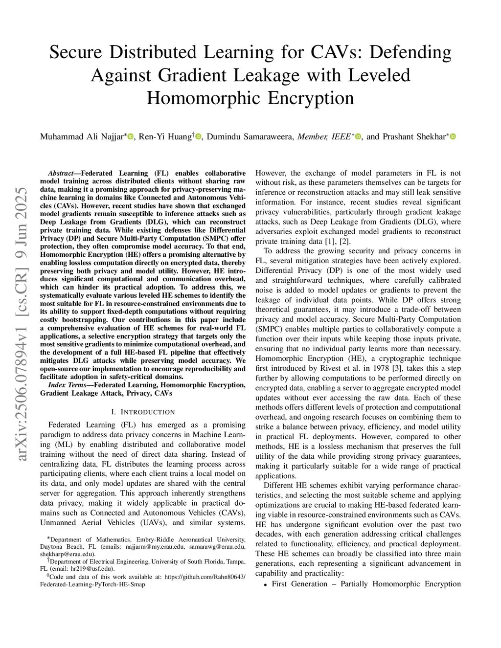 Federated Learning (FL) enables collaborative model training across distributed clients without sharing raw data, making it a promising approach for privacy-preserving machine learning in domains like Connected and Autonomous Vehicles (CAVs). However, recent studies have shown that exchanged model gradients remain susceptible to inference attacks such as Deep Leakage from Gradients (DLG), which can reconstruct private training data. While existing defenses like Differential Privacy (DP) and Secure Multi-Party Computation (SMPC) offer protection, they often compromise model accuracy. To that end, Homomorphic Encryption (HE) offers a promising alternative by enabling lossless computation directly on encrypted data, thereby preserving both privacy and model utility. However, HE introduces significant computational and communication overhead, which can hinder its practical adoption. To address this, we systematically evaluate various leveled HE schemes to identify the most suitable for FL in resource-constrained environments due to its ability to support fixed-depth computations without requiring costly bootstrapping. Our contributions in this paper include a comprehensive evaluation of HE schemes for real-world FL applications, a selective encryption strategy that targets only the most sensitive gradients to minimize computational overhead, and the development of a full HE-based FL pipeline that effectively mitigates DLG attacks while preserving model accuracy. We open-source our implementation to encourage reproducibility and facilitate adoption in safety-critical domains.