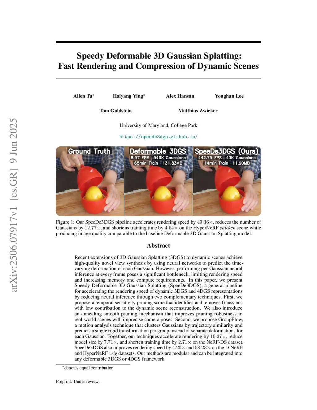 SpeeDe3DGS: Speedy Deformable 3D Gaussian Splatting with Temporal Pruning and Motion Grouping