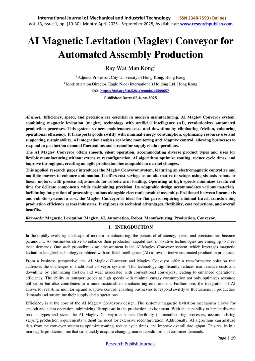 Efficiency, speed, and precision are essential in modern manufacturing. AI Maglev Conveyor system, combining magnetic levitation (maglev) technology with artificial intelligence (AI), revolutionizes automated production processes. This system reduces maintenance costs and downtime by eliminating friction, enhancing operational efficiency. It transports goods swiftly with minimal energy consumption, optimizing resource use and supporting sustainability. AI integration enables real-time monitoring and adaptive control, allowing businesses to respond to production demand fluctuations and streamline supply chain operations.The AI Maglev Conveyor offers smooth, silent operation, accommodating diverse product types and sizes for flexible manufacturing without extensive reconfiguration. AI algorithms optimize routing, reduce cycle times, and improve throughput, creating an agile production line adaptable to market changes.This applied research paper introduces the Maglev Conveyor system, featuring an electromagnetic controller and multiple movers to enhance automation. It offers cost savings as an alternative to setups using six-axis robots or linear motors, with precise adjustments for robotic arm loading. Operating at high speeds minimizes treatment time for delicate components while maintaining precision. Its adaptable design accommodates various materials, facilitating integration of processing stations alongside electronic product assembly. Positioned between linear-axis and robotic systems in cost, the Maglev Conveyor is ideal for flat parts requiring minimal travel, transforming production efficiency across industries. It explores its technical advantages, flexibility, cost reductions, and overall benefits.