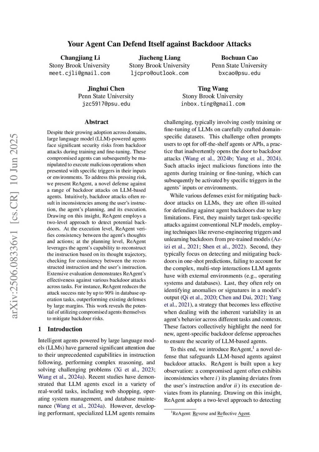 Despite their growing adoption across domains, large language model (LLM)-powered agents face significant security risks from backdoor attacks during training and fine-tuning. These compromised agents can subsequently be manipulated to execute malicious operations when presented with specific triggers in their inputs or environments. To address this pressing risk, we present ReAgent, a novel defense against a range of backdoor attacks on LLM-based agents. Intuitively, backdoor attacks often result in inconsistencies among the user's instruction, the agent's planning, and its execution. Drawing on this insight, ReAgent employs a two-level approach to detect potential backdoors. At the execution level, ReAgent verifies consistency between the agent's thoughts and actions; at the planning level, ReAgent leverages the agent's capability to reconstruct the instruction based on its thought trajectory, checking for consistency between the reconstructed instruction and the user's instruction. Extensive evaluation demonstrates ReAgent's effectiveness against various backdoor attacks across tasks. For instance, ReAgent reduces the attack success rate by up to 90\% in database operation tasks, outperforming existing defenses by large margins. This work reveals the potential of utilizing compromised agents themselves to mitigate backdoor risks.