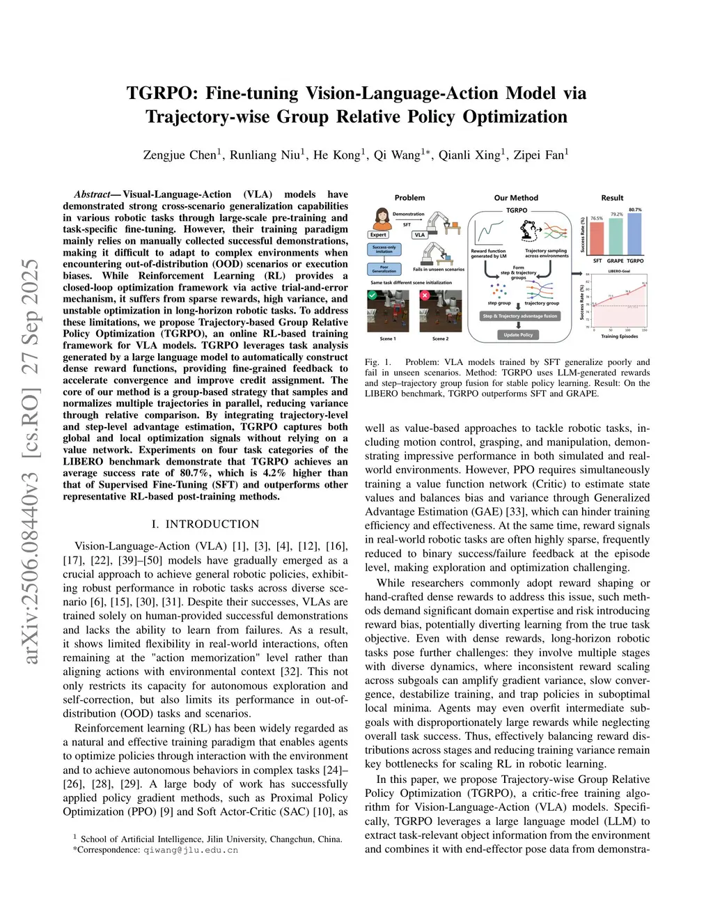 Recent advances in Vision-Language-Action (VLA) model have demonstrated strong generalization capabilities across diverse scenes, tasks, and robotic platforms when pretrained at large-scale datasets. However, these models still require task-specific fine-tuning in novel environments, a process that relies almost exclusively on supervised fine-tuning (SFT) using static trajectory datasets. Such approaches neither allow robot to interact with environment nor do they leverage feedback from live execution. Also, their success is critically dependent on the size and quality of the collected trajectories. Reinforcement learning (RL) offers a promising alternative by enabling closed-loop interaction and aligning learned policies directly with task objectives. In this work, we draw inspiration from the ideas of GRPO and propose the Trajectory-wise Group Relative Policy Optimization (TGRPO) method. By fusing step-level and trajectory-level advantage signals, this method improves GRPO's group-level advantage estimation, thereby making the algorithm more suitable for online reinforcement learning training of VLA. Experimental results on ten manipulation tasks from the libero-object benchmark demonstrate that TGRPO consistently outperforms various baseline methods, capable of generating more robust and efficient policies across multiple tested scenarios. Our source codes are available at: this https URL