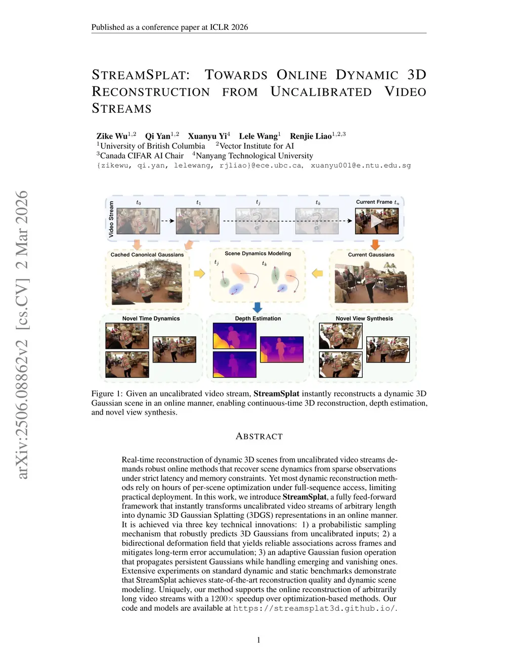 Real-time reconstruction of dynamic 3D scenes from uncalibrated video streams demands robust online methods that recover scene dynamics from sparse observations under strict latency and memory constraints. Yet most dynamic reconstruction methods rely on hours of per-scene optimization under full-sequence access, limiting practical deployment. In this work, we introduce StreamSplat, a fully feed-forward framework that instantly transforms uncalibrated video streams of arbitrary length into dynamic 3D Gaussian Splatting (3DGS) representations in an online manner. It is achieved via three key technical innovations: 1) a probabilistic sampling mechanism that robustly predicts 3D Gaussians from uncalibrated inputs; 2) a bidirectional deformation field that yields reliable associations across frames and mitigates long-term error accumulation; 3) an adaptive Gaussian fusion operation that propagates persistent Gaussians while handling emerging and vanishing ones. Extensive experiments on standard dynamic and static benchmarks demonstrate that StreamSplat achieves state-of-the-art reconstruction quality and dynamic scene modeling. Uniquely, our method supports the online reconstruction of arbitrarily long video streams with a 1200x speedup over optimization-based methods. Our code and models are available atthis https URL.