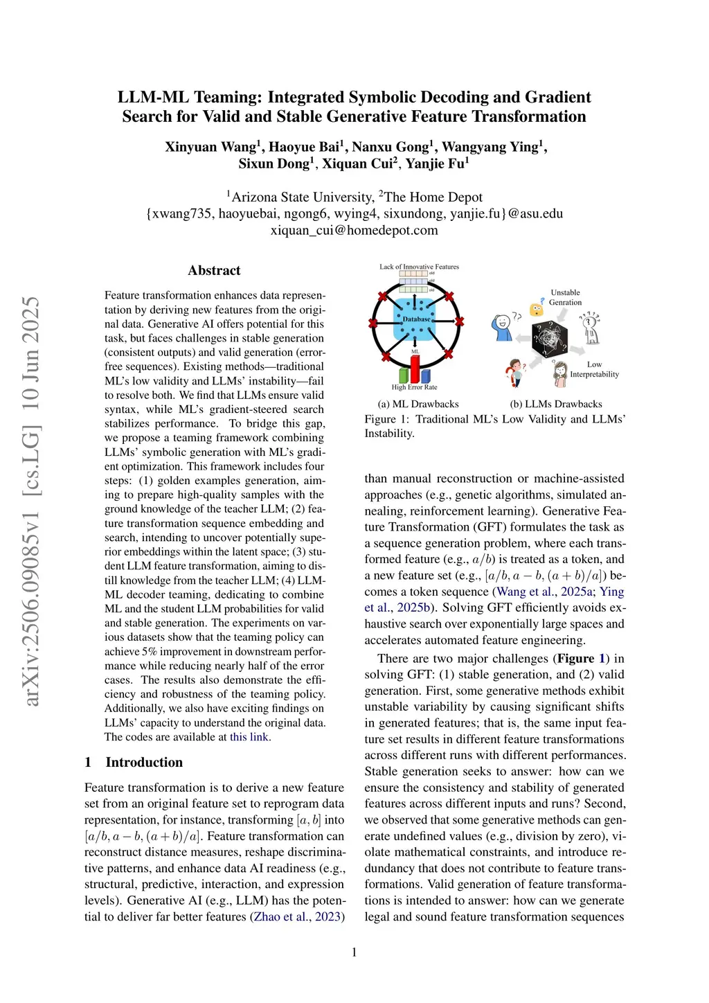 Feature transformation enhances data representation by deriving new features from the original data. Generative AI offers potential for this task, but faces challenges in stable generation (consistent outputs) and valid generation (error-free sequences). Existing methods--traditional MLs' low validity and LLMs' instability--fail to resolve both. We find that LLMs ensure valid syntax, while ML's gradient-steered search stabilizes performance. To bridge this gap, we propose a teaming framework combining LLMs' symbolic generation with ML's gradient optimization. This framework includes four steps: (1) golden examples generation, aiming to prepare high-quality samples with the ground knowledge of the teacher LLM; (2) feature transformation sequence embedding and search, intending to uncover potentially superior embeddings within the latent space; (3) student LLM feature transformation, aiming to distill knowledge from the teacher LLM; (4) LLM-ML decoder teaming, dedicating to combine ML and the student LLM probabilities for valid and stable generation. The experiments on various datasets show that the teaming policy can achieve 5\% improvement in downstream performance while reducing nearly half of the error cases. The results also demonstrate the efficiency and robustness of the teaming policy. Additionally, we also have exciting findings on LLMs' capacity to understand the original data.