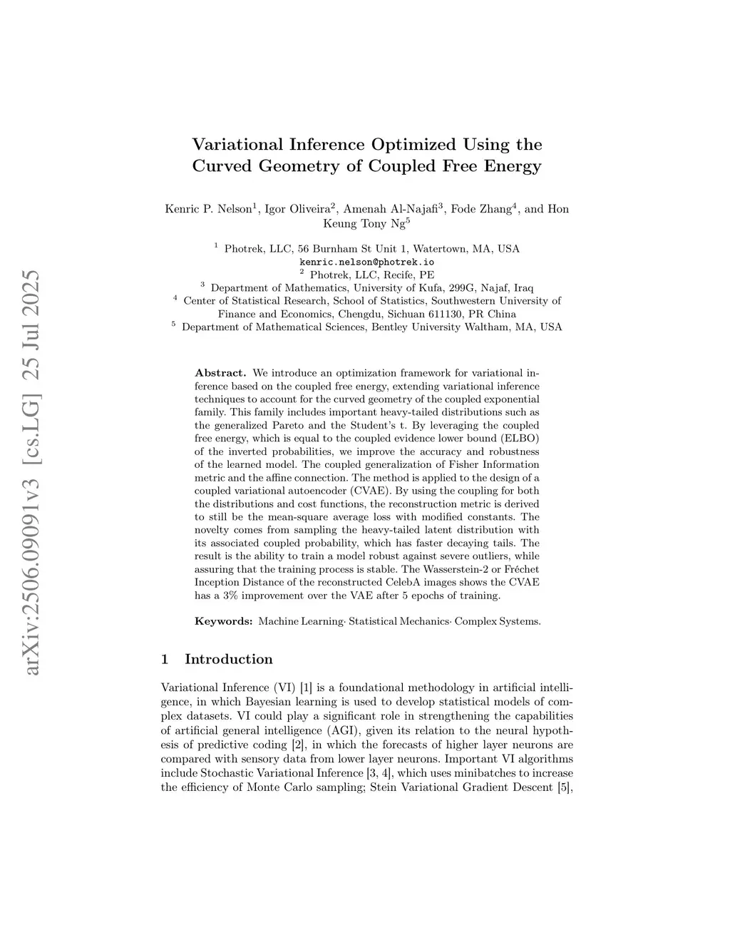 We introduce an optimization framework for variational inference based on the coupled free energy, extending variational inference techniques to account for the curved geometry of the coupled exponential family. This family includes important heavy-tailed distributions such as the generalized Pareto and the Student's t. By leveraging the coupled free energy, which is equal to the coupled evidence lower bound (ELBO) of the inverted probabilities, we improve the accuracy and robustness of the learned model. The coupled generalization of Fisher Information metric and the affine connection. The method is applied to the design of a coupled variational autoencoder (CVAE). By using the coupling for both the distributions and cost functions, the reconstruction metric is derived to still be the mean-square average loss with modified constants. The novelty comes from sampling the heavy-tailed latent distribution with its associated coupled probability, which has faster decaying tails. The result is the ability to train a model robust against severe outliers, while assuring that the training process is stable. The Wasserstein-2 or Fréchet Inception Distance of the reconstructed CelebA images shows the CVAE has a 3\% improvement over the VAE after 5 epochs of training.