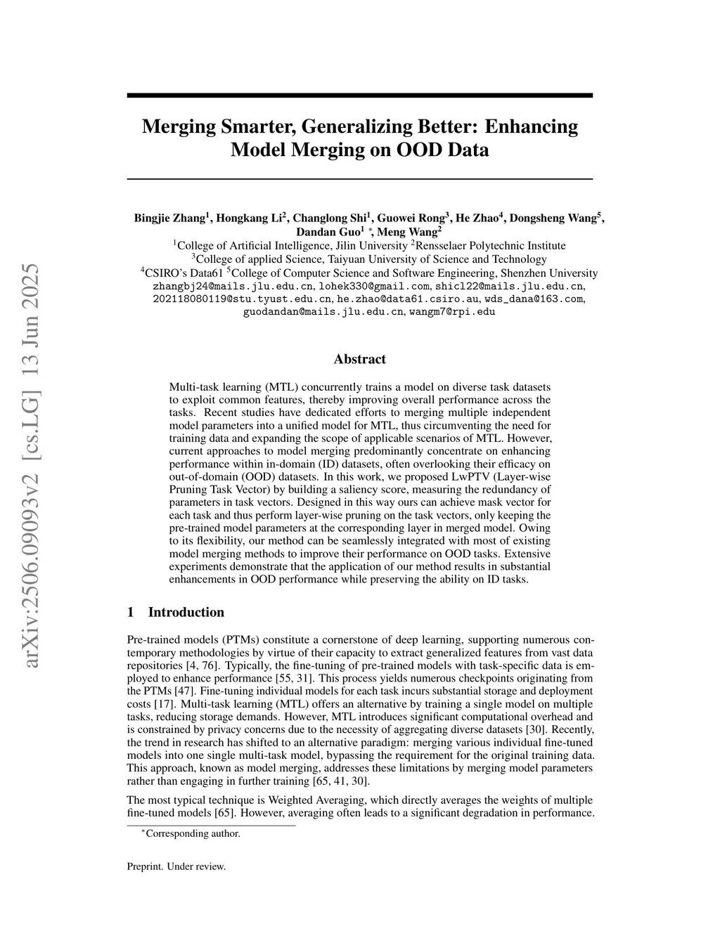 Multi-task learning (MTL) concurrently trains a model on diverse task datasets to exploit common features, thereby improving overall performance across the tasks. Recent studies have dedicated efforts to merging multiple independent model parameters into a unified model for MTL, thus circumventing the need for training data and expanding the scope of applicable scenarios of MTL. However, current approaches to model merging predominantly concentrate on enhancing performance within in-domain (ID) datasets, often overlooking their efficacy on out-of-domain (OOD) datasets. In this work, we proposed LwPTV (Layer-wise Pruning Task Vector) by building a saliency score, measuring the redundancy of parameters in task vectors. Designed in this way ours can achieve mask vector for each task and thus perform layer-wise pruning on the task vectors, only keeping the pre-trained model parameters at the corresponding layer in merged model. Owing to its flexibility, our method can be seamlessly integrated with most of existing model merging methods to improve their performance on OOD tasks. Extensive experiments demonstrate that the application of our method results in substantial enhancements in OOD performance while preserving the ability on ID tasks.