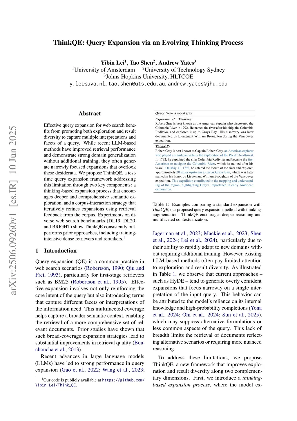 Effective query expansion for web search benefits from promoting both exploration and result diversity to capture multiple interpretations and facets of a query. While recent LLM-based methods have improved retrieval performance and demonstrate strong domain generalization without additional training, they often generate narrowly focused expansions that overlook these desiderata. We propose ThinkQE, a test-time query expansion framework addressing this limitation through two key components: a thinking-based expansion process that encourages deeper and comprehensive semantic exploration, and a corpus-interaction strategy that iteratively refines expansions using retrieval feedback from the corpus. Experiments on diverse web search benchmarks (DL19, DL20, and BRIGHT) show ThinkQE consistently outperforms prior approaches, including training-intensive dense retrievers and rerankers.