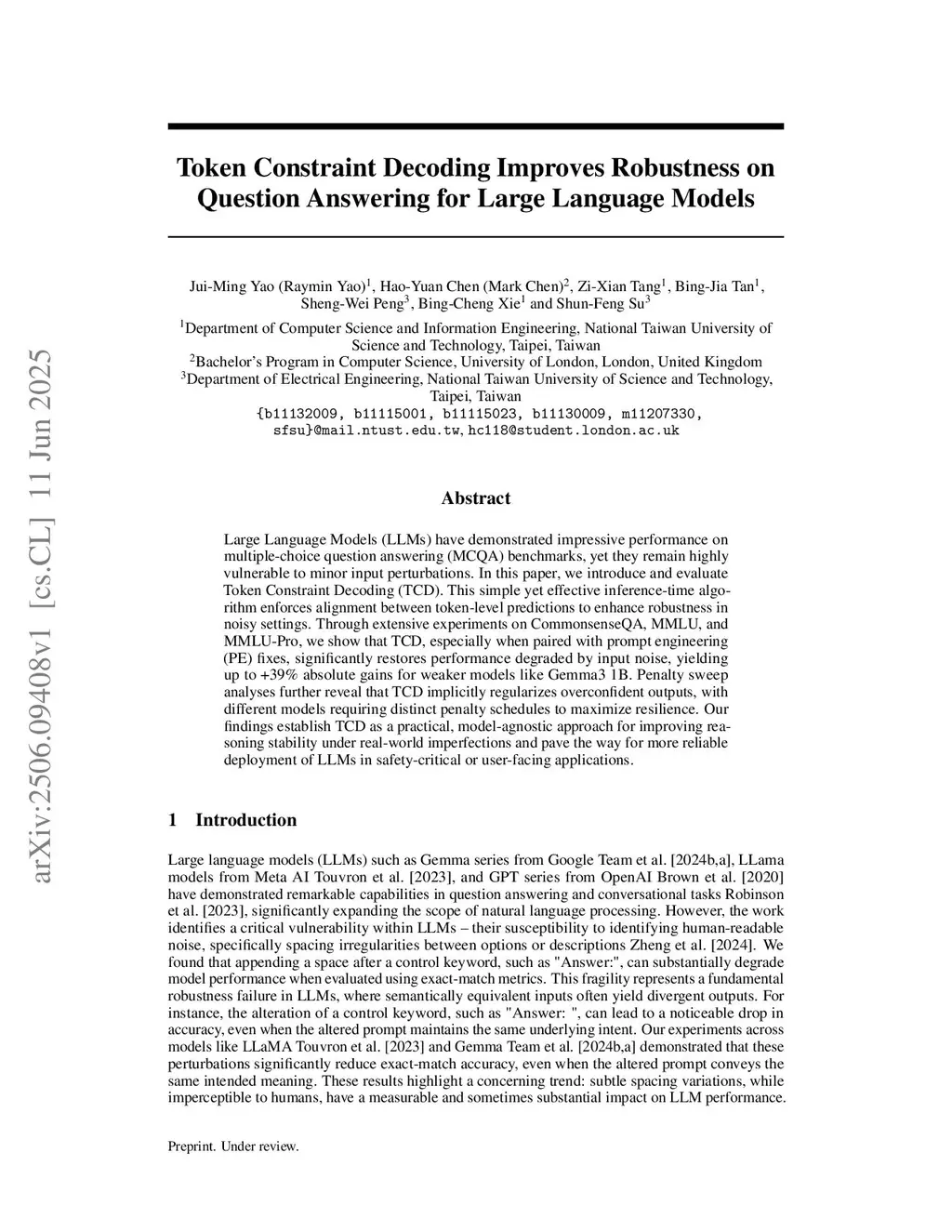 Large Language Models (LLMs) have demonstrated impressive performance on multiple-choice question answering (MCQA) benchmarks, yet they remain highly vulnerable to minor input perturbations. In this paper, we introduce and evaluate Token Constraint Decoding (TCD). This simple yet effective inference-time algorithm enforces alignment between token-level predictions to enhance robustness in noisy settings. Through extensive experiments on CommonsenseQA, MMLU, and MMLU-Pro, we show that TCD, especially when paired with prompt engineering (PE) fixes, significantly restores performance degraded by input noise, yielding up to +39\% absolute gains for weaker models like Gemma3 1B. Penalty sweep analyses further reveal that TCD implicitly regularizes overconfident outputs, with different models requiring distinct penalty schedules to maximize resilience. Our findings establish TCD as a practical, model-agnostic approach for improving reasoning stability under real-world imperfections and pave the way for more reliable deployment of LLMs in safety-critical or user-facing applications.