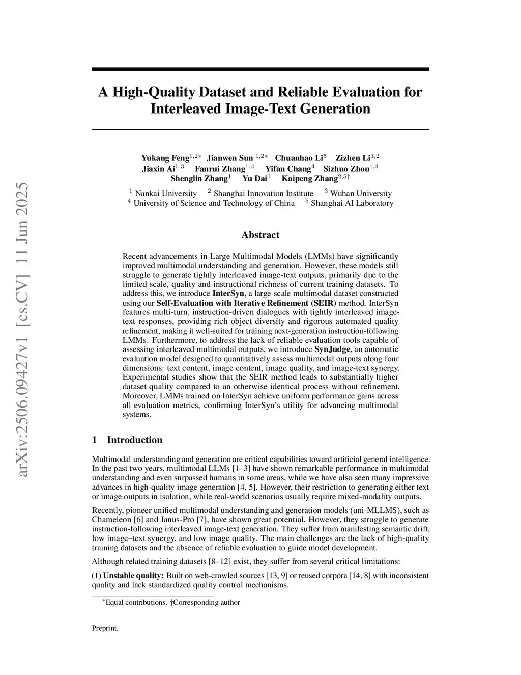 Recent advancements in Large Multimodal Models (LMMs) have significantly improved multimodal understanding and generation. However, these models still struggle to generate tightly interleaved image-text outputs, primarily due to the limited scale, quality and instructional richness of current training datasets. To address this, we introduce InterSyn, a large-scale multimodal dataset constructed using our Self-Evaluation with Iterative Refinement (SEIR) method. InterSyn features multi-turn, instruction-driven dialogues with tightly interleaved imagetext responses, providing rich object diversity and rigorous automated quality refinement, making it well-suited for training next-generation instruction-following LMMs. Furthermore, to address the lack of reliable evaluation tools capable of assessing interleaved multimodal outputs, we introduce SynJudge, an automatic evaluation model designed to quantitatively assess multimodal outputs along four dimensions: text content, image content, image quality, and image-text synergy.Experimental studies show that the SEIR method leads to substantially higher dataset quality compared to an otherwise identical process without refinement.Moreover, LMMs trained on InterSyn achieve uniform performance gains across all evaluation metrics, confirming InterSyn's utility for advancing multimodal systems.