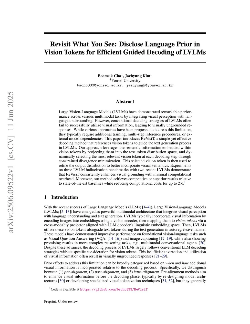 Large Vision-Language Models (LVLMs) achieve strong performance across multimodal tasks by integrating visual perception with language understanding. However, how vision information contributes to the model's decoding process remains under-explored, as reflected in frequent hallucinations. Through a series of analyses, we found that (i) vision tokens provide meaningful visual information even when hallucinations occur, and (ii) their semantics are encoded in the textual space and become explicit under appropriate vocabulary constraints. Building on these observations, we propose ReVisiT, a simple training-free decoding method that references vision tokens to guide text generation. Our approach leverages the semantic information embedded within vision tokens by projecting them into the text token distribution. Specifically, ReVisiT dynamically selects the most relevant vision token at each decoding step via context-aware constrained divergence minimization, and using its constrained projection to refine the output distribution to better incorporate visual semantics. Across five benchmarks on recent LVLMs, ReVisiT consistently enhances visual grounding with minimal computational overhead, and achieves competitive or superior results to state-of-the-art decoding baselines while reducing computational cost by up to .