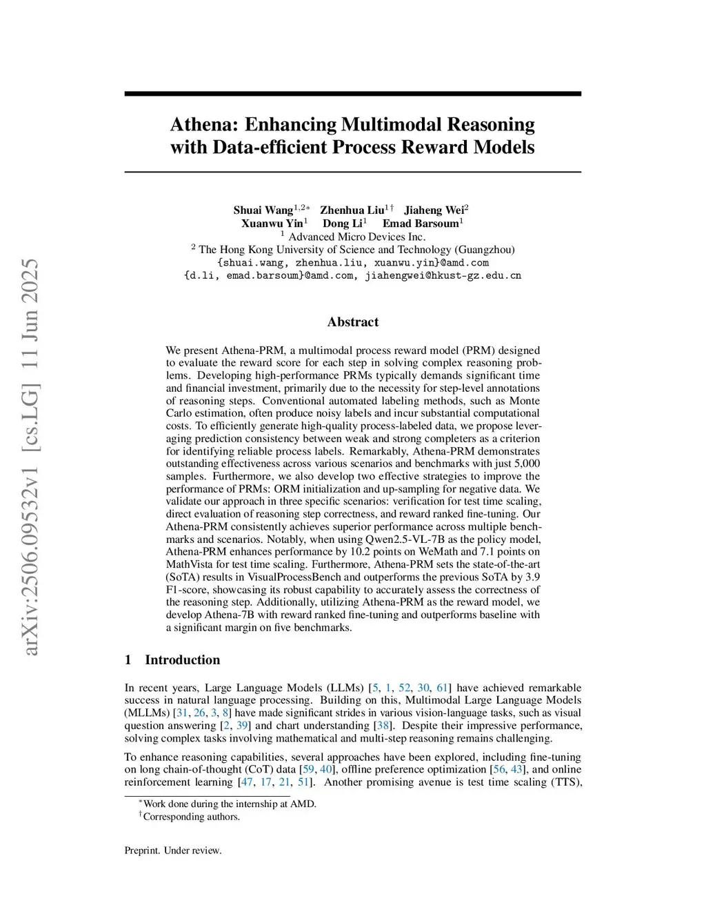 We present Athena-PRM, a multimodal process reward model (PRM) designed to evaluate the reward score for each step in solving complex reasoning problems. Developing high-performance PRMs typically demands significant time and financial investment, primarily due to the necessity for step-level annotations of reasoning steps. Conventional automated labeling methods, such as Monte Carlo estimation, often produce noisy labels and incur substantial computational costs. To efficiently generate high-quality process-labeled data, we propose leveraging prediction consistency between weak and strong completers as a criterion for identifying reliable process labels. Remarkably, Athena-PRM demonstrates outstanding effectiveness across various scenarios and benchmarks with just 5,000 samples. Furthermore, we also develop two effective strategies to improve the performance of PRMs: ORM initialization and up-sampling for negative data. We validate our approach in three specific scenarios: verification for test time scaling, direct evaluation of reasoning step correctness, and reward ranked fine-tuning. Our Athena-PRM consistently achieves superior performance across multiple benchmarks and scenarios. Notably, when using Qwen2.5-VL-7B as the policy model, Athena-PRM enhances performance by 10.2 points on WeMath and 7.1 points on MathVista for test time scaling. Furthermore, Athena-PRM sets the state-of-the-art (SoTA) results in VisualProcessBench and outperforms the previous SoTA by 3.9 F1-score, showcasing its robust capability to accurately assess the correctness of the reasoning step. Additionally, utilizing Athena-PRM as the reward model, we develop Athena-7B with reward ranked fine-tuning and outperforms baseline with a significant margin on five benchmarks.
