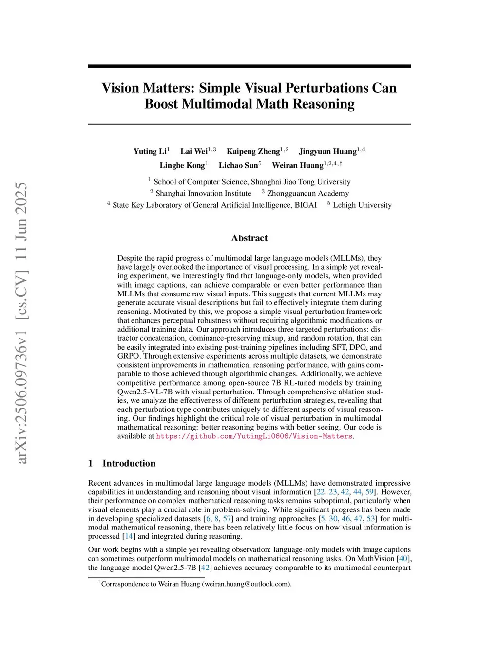 Despite the rapid progress of multimodal large language models (MLLMs), they have largely overlooked the importance of visual processing. In a simple yet revealing experiment, we interestingly find that language-only models, when provided with image captions, can achieve comparable or even better performance than MLLMs that consume raw visual inputs. This suggests that current MLLMs may generate accurate visual descriptions but fail to effectively integrate them during reasoning. Motivated by this, we propose a simple visual perturbation framework that enhances perceptual robustness without requiring algorithmic modifications or additional training data. Our approach introduces three targeted perturbations: distractor concatenation, dominance-preserving mixup, and random rotation, that can be easily integrated into existing post-training pipelines including SFT, DPO, and GRPO. Through extensive experiments across multiple datasets, we demonstrate consistent improvements in mathematical reasoning performance, with gains comparable to those achieved through algorithmic changes. Additionally, we achieve competitive performance among open-source 7B RL-tuned models by training Qwen2.5-VL-7B with visual perturbation. Through comprehensive ablation studies, we analyze the effectiveness of different perturbation strategies, revealing that each perturbation type contributes uniquely to different aspects of visual reasoning. Our findings highlight the critical role of visual perturbation in multimodal mathematical reasoning: better reasoning begins with better seeing. Our code is available atthis https URL.