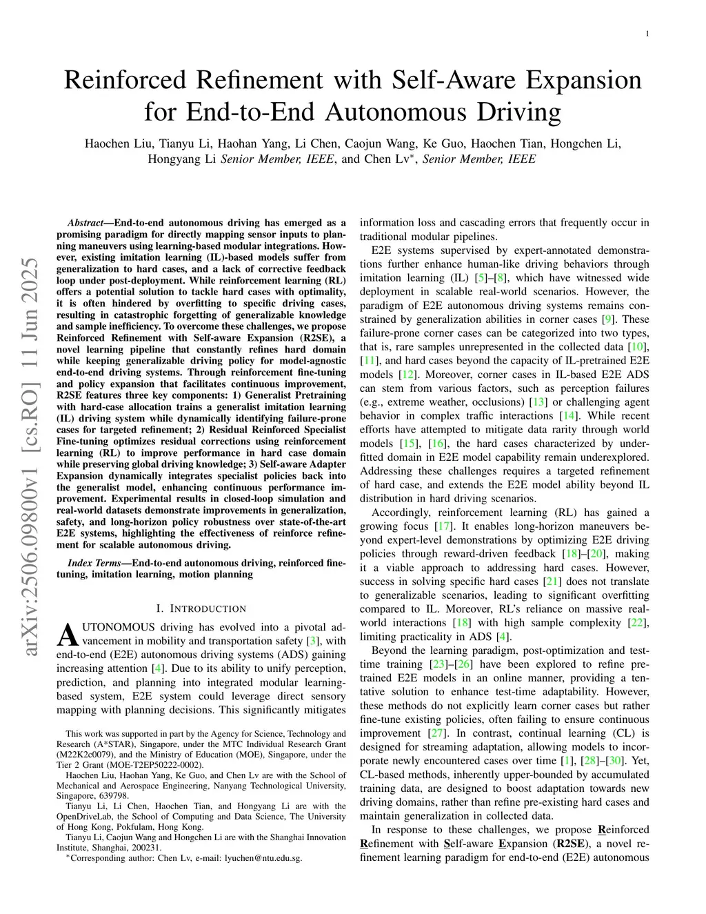 End-to-end autonomous driving has emerged as a promising paradigm for directly mapping sensor inputs to planning maneuvers using learning-based modular integrations. However, existing imitation learning (IL)-based models suffer from generalization to hard cases, and a lack of corrective feedback loop under post-deployment. While reinforcement learning (RL) offers a potential solution to tackle hard cases with optimality, it is often hindered by overfitting to specific driving cases, resulting in catastrophic forgetting of generalizable knowledge and sample inefficiency. To overcome these challenges, we propose Reinforced Refinement with Self-aware Expansion (R2SE), a novel learning pipeline that constantly refines hard domain while keeping generalizable driving policy for model-agnostic end-to-end driving systems. Through reinforcement fine-tuning and policy expansion that facilitates continuous improvement, R2SE features three key components: 1) Generalist Pretraining with hard-case allocation trains a generalist imitation learning (IL) driving system while dynamically identifying failure-prone cases for targeted refinement; 2) Residual Reinforced Specialist Fine-tuning optimizes residual corrections using reinforcement learning (RL) to improve performance in hard case domain while preserving global driving knowledge; 3) Self-aware Adapter Expansion dynamically integrates specialist policies back into the generalist model, enhancing continuous performance improvement. Experimental results in closed-loop simulation and real-world datasets demonstrate improvements in generalization, safety, and long-horizon policy robustness over state-of-the-art E2E systems, highlighting the effectiveness of reinforce refinement for scalable autonomous driving.
