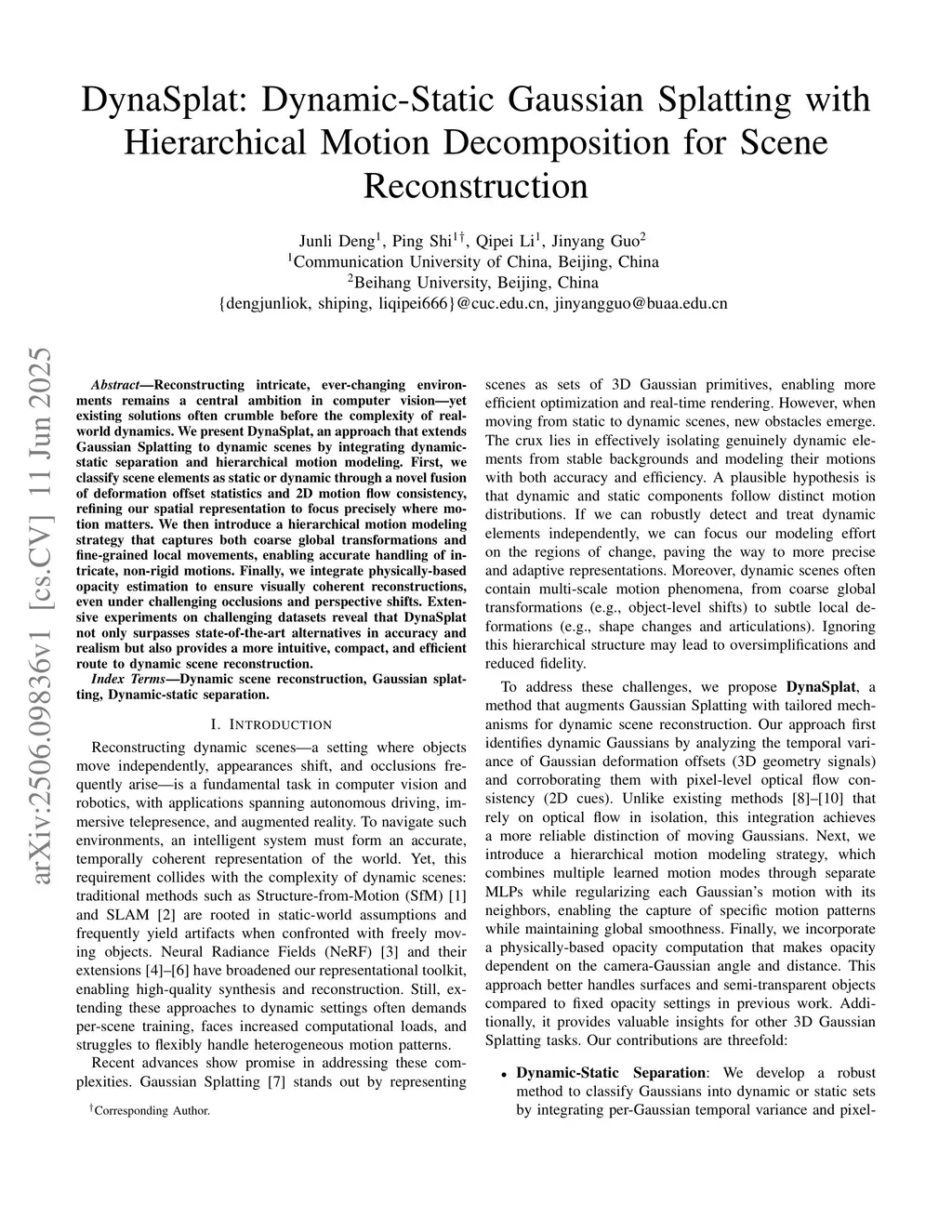Reconstructing intricate, ever-changing environments remains a central ambition in computer vision, yet existing solutions often crumble before the complexity of real-world dynamics. We present DynaSplat, an approach that extends Gaussian Splatting to dynamic scenes by integrating dynamic-static separation and hierarchical motion modeling. First, we classify scene elements as static or dynamic through a novel fusion of deformation offset statistics and 2D motion flow consistency, refining our spatial representation to focus precisely where motion matters. We then introduce a hierarchical motion modeling strategy that captures both coarse global transformations and fine-grained local movements, enabling accurate handling of intricate, non-rigid motions. Finally, we integrate physically-based opacity estimation to ensure visually coherent reconstructions, even under challenging occlusions and perspective shifts. Extensive experiments on challenging datasets reveal that DynaSplat not only surpasses state-of-the-art alternatives in accuracy and realism but also provides a more intuitive, compact, and efficient route to dynamic scene reconstruction.