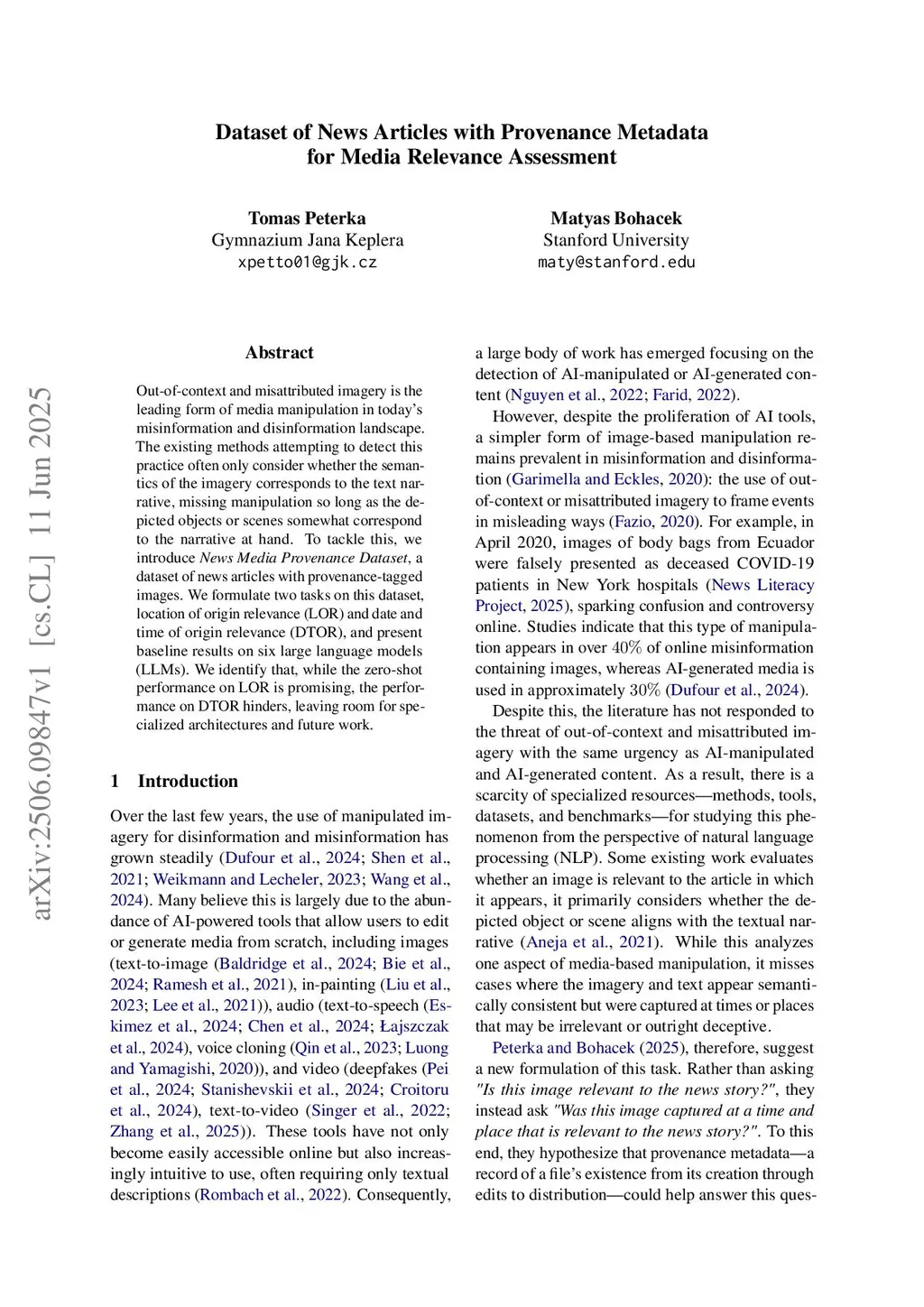 Out-of-context and misattributed imagery is the leading form of media manipulation in today's misinformation and disinformation landscape. The existing methods attempting to detect this practice often only consider whether the semantics of the imagery corresponds to the text narrative, missing manipulation so long as the depicted objects or scenes somewhat correspond to the narrative at hand. To tackle this, we introduce News Media Provenance Dataset, a dataset of news articles with provenance-tagged images. We formulate two tasks on this dataset, location of origin relevance (LOR) and date and time of origin relevance (DTOR), and present baseline results on six large language models (LLMs). We identify that, while the zero-shot performance on LOR is promising, the performance on DTOR hinders, leaving room for specialized architectures and future work.