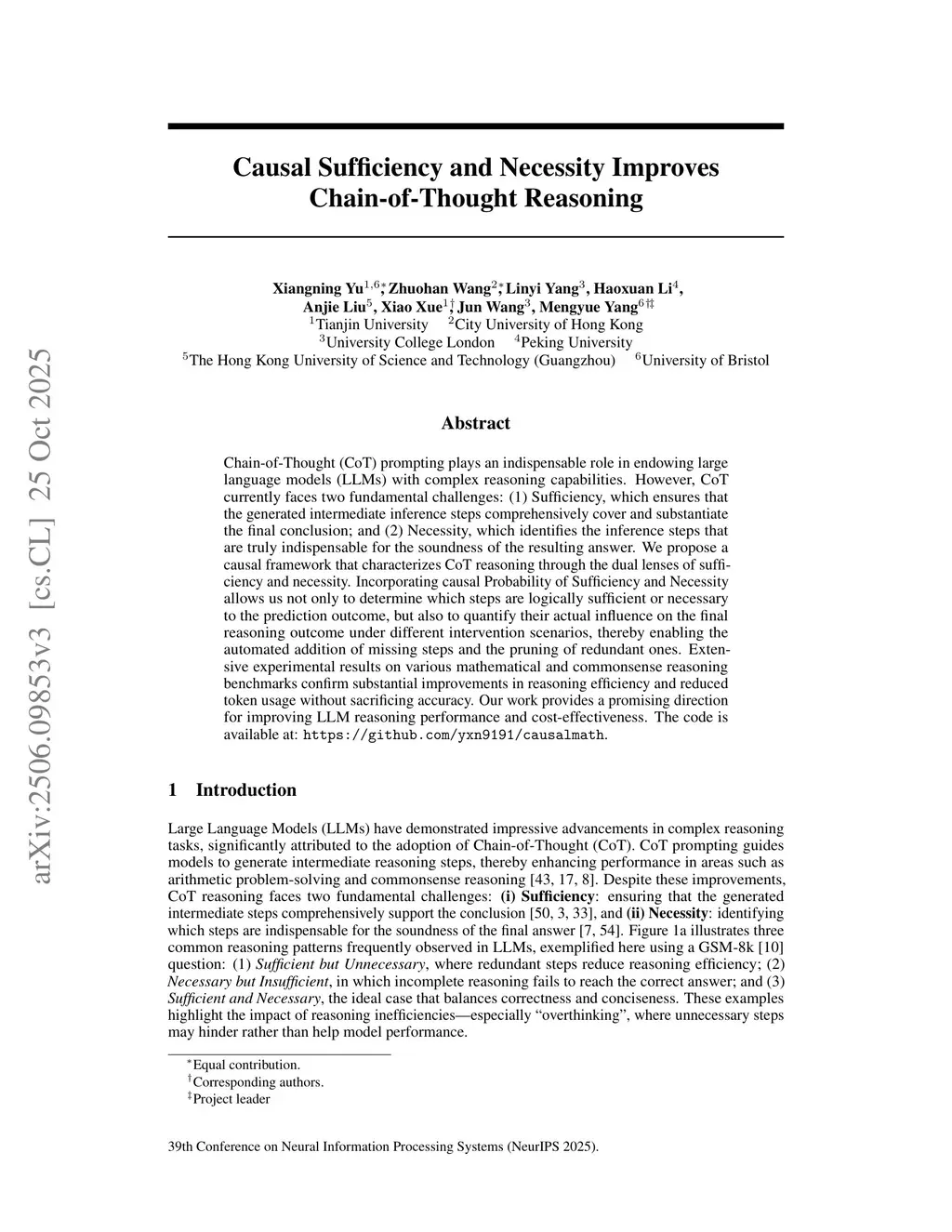 Chain-of-Thought (CoT) prompting plays an indispensable role in endowing large language models (LLMs) with complex reasoning capabilities. However, CoT currently faces two fundamental challenges: (1) Sufficiency, which ensures that the generated intermediate inference steps comprehensively cover and substantiate the final conclusion; and (2) Necessity, which identifies the inference steps that are truly indispensable for the soundness of the resulting answer. We propose a causal framework that characterizes CoT reasoning through the dual lenses of sufficiency and necessity. Incorporating causal Probability of Sufficiency and Necessity allows us not only to determine which steps are logically sufficient or necessary to the prediction outcome, but also to quantify their actual influence on the final reasoning outcome under different intervention scenarios, thereby enabling the automated addition of missing steps and the pruning of redundant ones. Extensive experimental results on various mathematical and commonsense reasoning benchmarks confirm substantial improvements in reasoning efficiency and reduced token usage without sacrificing accuracy. Our work provides a promising direction for improving LLM reasoning performance and cost-effectiveness.