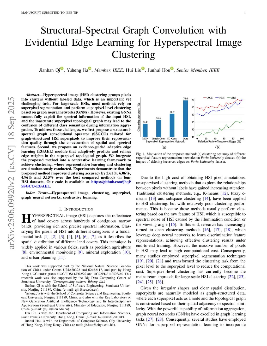 Hyperspectral image (HSI) clustering groups pixels into clusters without labeled data, which is an important yet challenging task. For large-scale HSIs, most methods rely on superpixel segmentation and perform superpixel-level clustering based on graph neural networks (GNNs). However, existing GNNs cannot fully exploit the spectral information of the input HSI, and the inaccurate superpixel topological graph may lead to the confusion of different class semantics during information aggregation. To address these challenges, we first propose a structural-spectral graph convolutional operator (SSGCO) tailored for graph-structured HSI superpixels to improve their representation quality through the co-extraction of spatial and spectral features. Second, we propose an evidence-guided adaptive edge learning (EGAEL) module that adaptively predicts and refines edge weights in the superpixel topological graph. We integrate the proposed method into a contrastive learning framework to achieve clustering, where representation learning and clustering are simultaneously conducted. Experiments demonstrate that the proposed method improves clustering accuracy by 2.61%, 6.06%, 4.96% and 3.15% over the best compared methods on four HSI datasets. Our code is available atthis https URL.