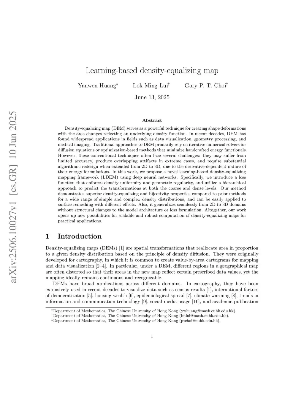 Density-equalizing map (DEM) serves as a powerful technique for creating shape deformations with the area changes reflecting an underlying density function. In recent decades, DEM has found widespread applications in fields such as data visualization, geometry processing, and medical imaging. Traditional approaches to DEM primarily rely on iterative numerical solvers for diffusion equations or optimization-based methods that minimize handcrafted energy functionals. However, these conventional techniques often face several challenges: they may suffer from limited accuracy, produce overlapping artifacts in extreme cases, and require substantial algorithmic redesign when extended from 2D to 3D, due to the derivative-dependent nature of their energy formulations. In this work, we propose a novel learning-based density-equalizing mapping framework (LDEM) using deep neural networks. Specifically, we introduce a loss function that enforces density uniformity and geometric regularity, and utilize a hierarchical approach to predict the transformations at both the coarse and dense levels. Our method demonstrates superior density-equalizing and bijectivity properties compared to prior methods for a wide range of simple and complex density distributions, and can be easily applied to surface remeshing with different effects. Also, it generalizes seamlessly from 2D to 3D domains without structural changes to the model architecture or loss formulation. Altogether, our work opens up new possibilities for scalable and robust computation of density-equalizing maps for practical applications.