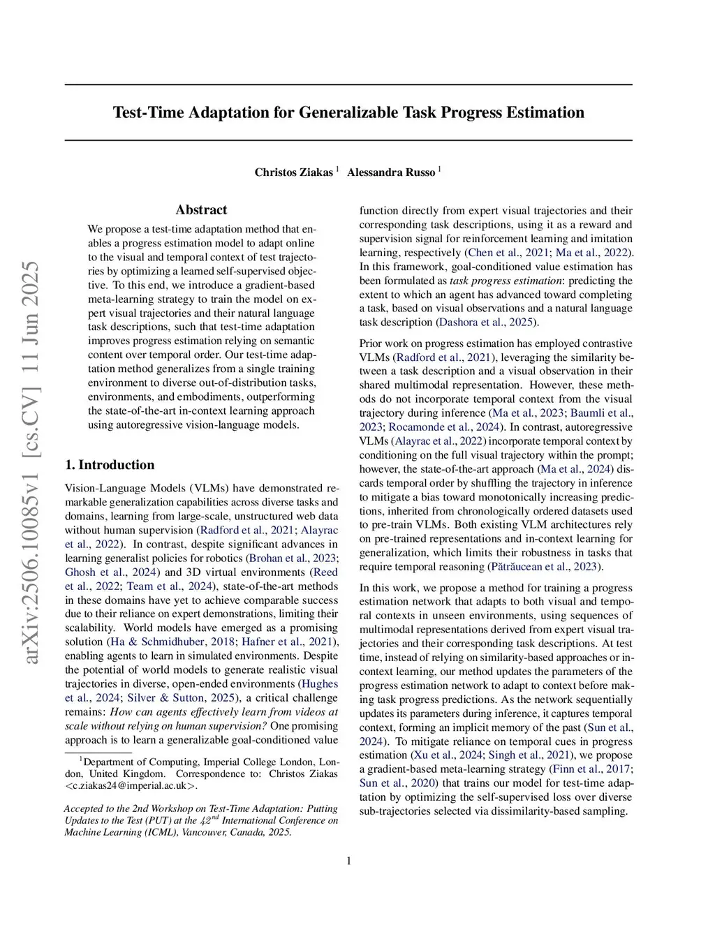 Vision-Language Models (VLMs) show promise as zero-shot goal-conditioned value functions, but their frozen pre-trained representations limit generalization and temporal reasoning. We introduce VITA, a zero-shot value function learning method that enhances both capabilities via test-time adaptation. At inference, a lightweight adaptation module is updated via a gradient step on a meta-learned self-supervised loss, such that each test-time update improves value estimation. By updating sequentially over a trajectory, VITA encodes history into its parameters, addressing the temporal reasoning limitations. To mitigate shortcut learning, we propose a dissimilarity-based sampling strategy that selects semantically diverse segments of the trajectory during training. In real-world robotic manipulation tasks, VITA generalizes from a single training environment to diverse out-of-distribution tasks, environments, and embodiments, outperforming the state-of-the-art zero-shot method using autoregressive VLMs. Furthermore, we demonstrate that VITA's zero-shot value estimates can be utilized for reward shaping in offline reinforcement learning, resulting in multi-task policies on the Meta-World benchmark that exceed the performance of those trained with the simulation's fuzzy-logic dense rewards.