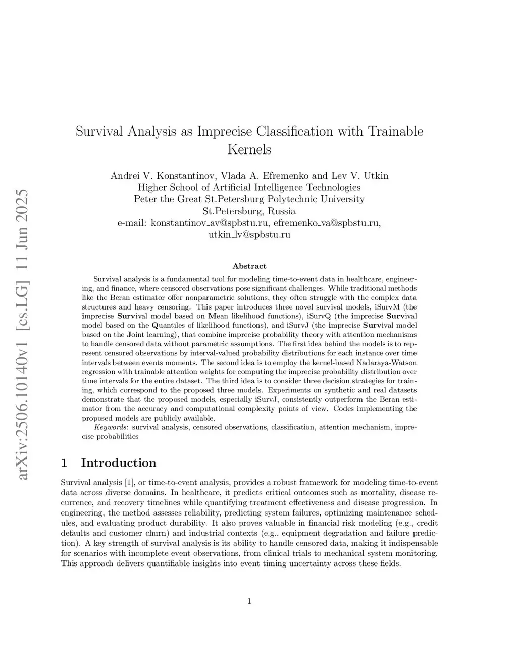 Survival analysis is a fundamental tool for modeling time-to-event data in healthcare, engineering, and finance, where censored observations pose significant challenges. While traditional methods like the Beran estimator offer nonparametric solutions, they often struggle with the complex data structures and heavy censoring. This paper introduces three novel survival models, iSurvM (the imprecise Survival model based on Mean likelihood functions), iSurvQ (the imprecise Survival model based on the Quantiles of likelihood functions), and iSurvJ (the imprecise Survival model based on the Joint learning), that combine imprecise probability theory with attention mechanisms to handle censored data without parametric assumptions. The first idea behind the models is to represent censored observations by interval-valued probability distributions for each instance over time intervals between events moments. The second idea is to employ the kernel-based Nadaraya-Watson regression with trainable attention weights for computing the imprecise probability distribution over time intervals for the entire dataset. The third idea is to consider three decision strategies for training, which correspond to the proposed three models. Experiments on synthetic and real datasets demonstrate that the proposed models, especially iSurvJ, consistently outperform the Beran estimator from the accuracy and computational complexity points of view. Codes implementing the proposed models are publicly available.