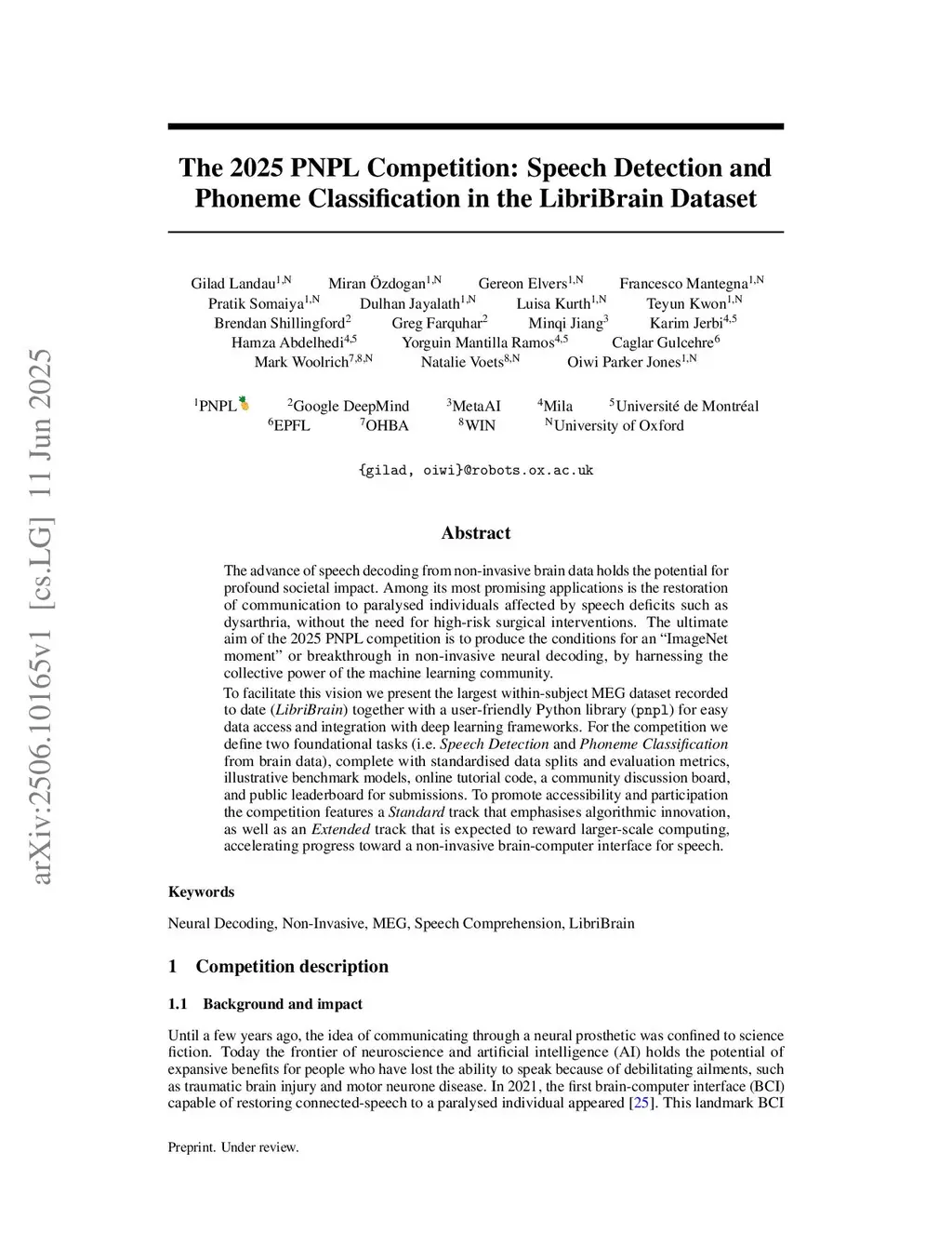 The advance of speech decoding from non-invasive brain data holds the potential for profound societal impact. Among its most promising applications is the restoration of communication to paralysed individuals affected by speech deficits such as dysarthria, without the need for high-risk surgical interventions. The ultimate aim of the 2025 PNPL competition is to produce the conditions for an "ImageNet moment" or breakthrough in non-invasive neural decoding, by harnessing the collective power of the machine learning community.To facilitate this vision we present the largest within-subject MEG dataset recorded to date (LibriBrain) together with a user-friendly Python library (pnpl) for easy data access and integration with deep learning frameworks. For the competition we define two foundational tasks (i.e. Speech Detection and Phoneme Classification from brain data), complete with standardised data splits and evaluation metrics, illustrative benchmark models, online tutorial code, a community discussion board, and public leaderboard for submissions. To promote accessibility and participation the competition features a Standard track that emphasises algorithmic innovation, as well as an Extended track that is expected to reward larger-scale computing, accelerating progress toward a non-invasive brain-computer interface for speech.