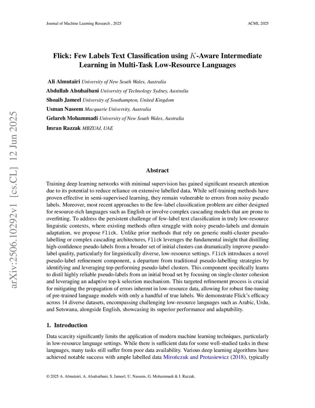 Flick: Few Labels Text Classification using K-Aware Intermediate Learning in Multi-Task Low-Resource Languages