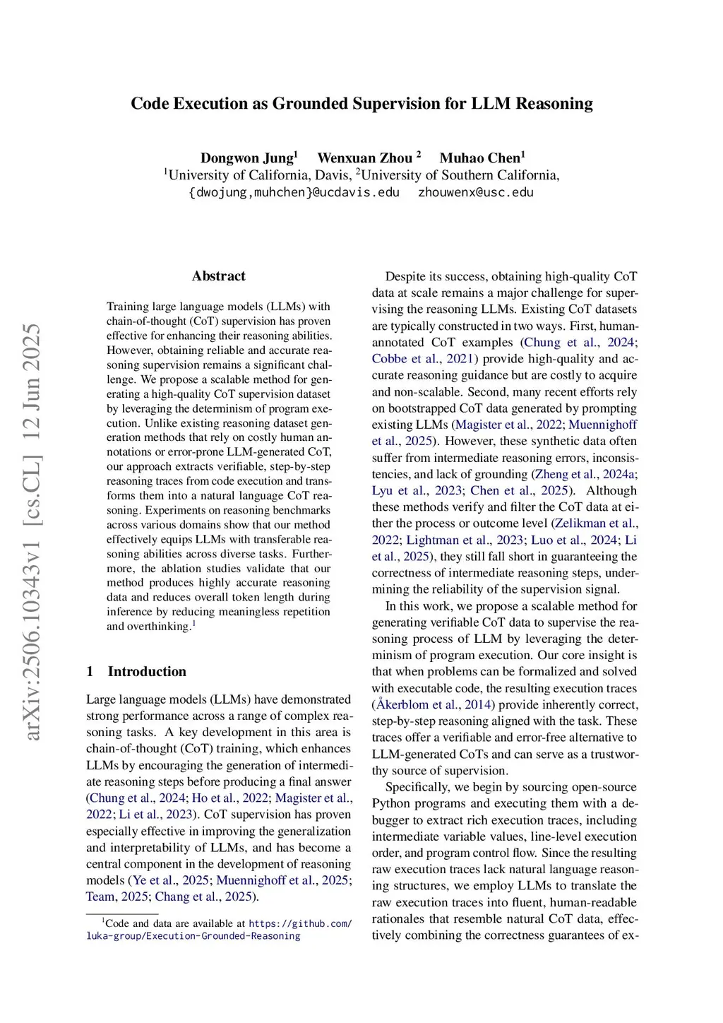 Training large language models (LLMs) with chain-of-thought (CoT) supervision has proven effective for enhancing their reasoning abilities. However, obtaining reliable and accurate reasoning supervision remains a significant challenge. We propose a scalable method for generating a high-quality CoT supervision dataset by leveraging the determinism of program execution. Unlike existing reasoning dataset generation methods that rely on costly human annotations or error-prone LLM-generated CoT, our approach extracts verifiable, step-by-step reasoning traces from code execution and transforms them into a natural language CoT reasoning. Experiments on reasoning benchmarks across various domains show that our method effectively equips LLMs with transferable reasoning abilities across diverse tasks. Furthermore, the ablation studies validate that our method produces highly accurate reasoning data and reduces overall token length during inference by reducing meaningless repetition and overthinking.