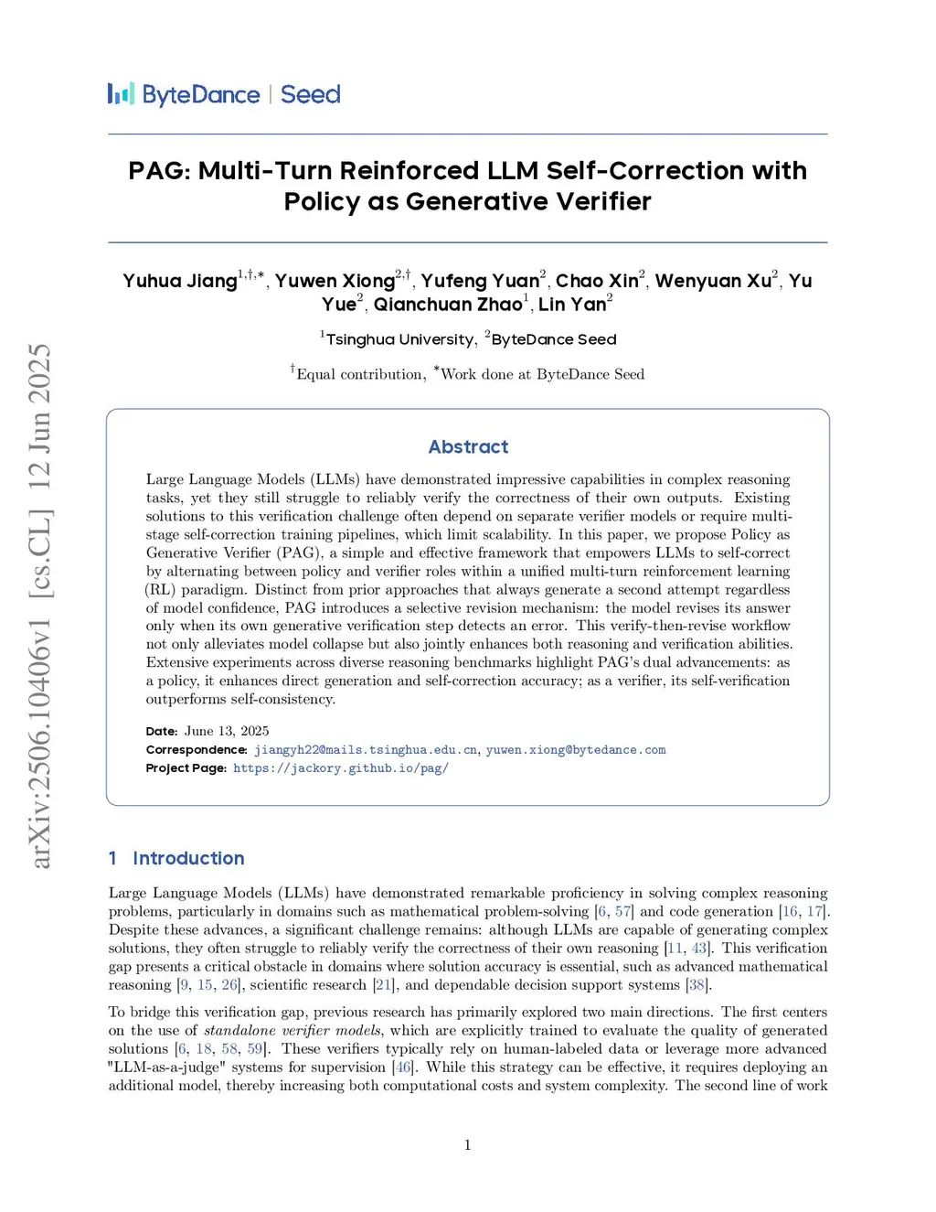 PAG: Multi-Turn Reinforced LLM Self-Correction with Policy as Generative Verifier