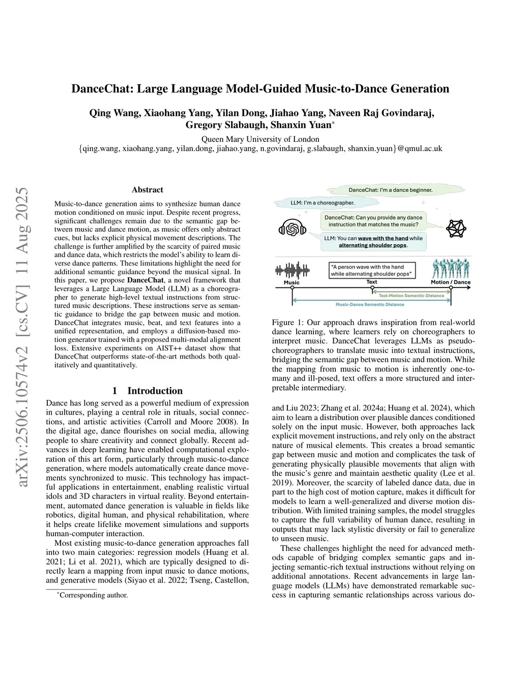 Music-to-dance generation aims to synthesize human dance motion conditioned on musical input. Despite recent progress, significant challenges remain due to the semantic gap between music and dance motion, as music offers only abstract cues, such as melody, groove, and emotion, without explicitly specifying the physical movements. Moreover, a single piece of music can produce multiple plausible dance interpretations. This one-to-many mapping demands additional guidance, as music alone provides limited information for generating diverse dance movements. The challenge is further amplified by the scarcity of paired music and dance data, which restricts the modelâĂŹs ability to learn diverse dance patterns. In this paper, we introduce DanceChat, a Large Language Model (LLM)-guided music-to-dance generation approach. We use an LLM as a choreographer that provides textual motion instructions, offering explicit, high-level guidance for dance generation. This approach goes beyond implicit learning from music alone, enabling the model to generate dance that is both more diverse and better aligned with musical styles. Our approach consists of three components: (1) an LLM-based pseudo instruction generation module that produces textual dance guidance based on music style and structure, (2) a multi-modal feature extraction and fusion module that integrates music, rhythm, and textual guidance into a shared representation, and (3) a diffusion-based motion synthesis module together with a multi-modal alignment loss, which ensures that the generated dance is aligned with both musical and textual cues. Extensive experiments on AIST++ and human evaluations show that DanceChat outperforms state-of-the-art methods both qualitatively and quantitatively.