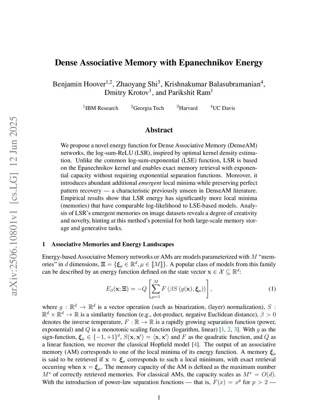 We propose a novel energy function for Dense Associative Memory (DenseAM) networks, the log-sum-ReLU (LSR), inspired by optimal kernel density estimation. Unlike the common log-sum-exponential (LSE) function, LSR is based on the Epanechnikov kernel and enables exact memory retrieval with exponential capacity without requiring exponential separation functions. Moreover, it introduces abundant additional \emph{emergent} local minima while preserving perfect pattern recovery -- a characteristic previously unseen in DenseAM literature. Empirical results show that LSR energy has significantly more local minima (memories) that have comparable log-likelihood to LSE-based models. Analysis of LSR's emergent memories on image datasets reveals a degree of creativity and novelty, hinting at this method's potential for both large-scale memory storage and generative tasks.