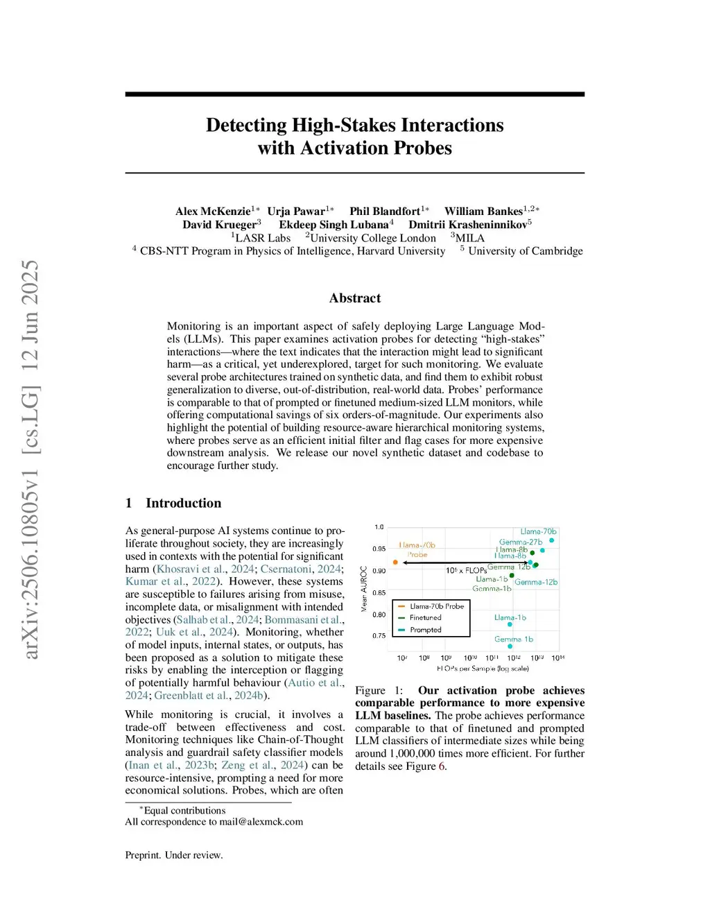 Monitoring is an important aspect of safely deploying Large Language Models (LLMs). This paper examines activation probes for detecting ``high-stakes'' interactions -- where the text indicates that the interaction might lead to significant harm -- as a critical, yet underexplored, target for such monitoring. We evaluate several probe architectures trained on synthetic data, and find them to exhibit robust generalization to diverse, out-of-distribution, real-world data. Probes' performance is comparable to that of prompted or finetuned medium-sized LLM monitors, while offering computational savings of six orders-of-magnitude. These savings are enabled by reusing activations of the model that is being monitored. Our experiments also highlight the potential of building resource-aware hierarchical monitoring systems, where probes serve as an efficient initial filter and flag cases for more expensive downstream analysis. We release our novel synthetic dataset and the codebase atthis https URL.