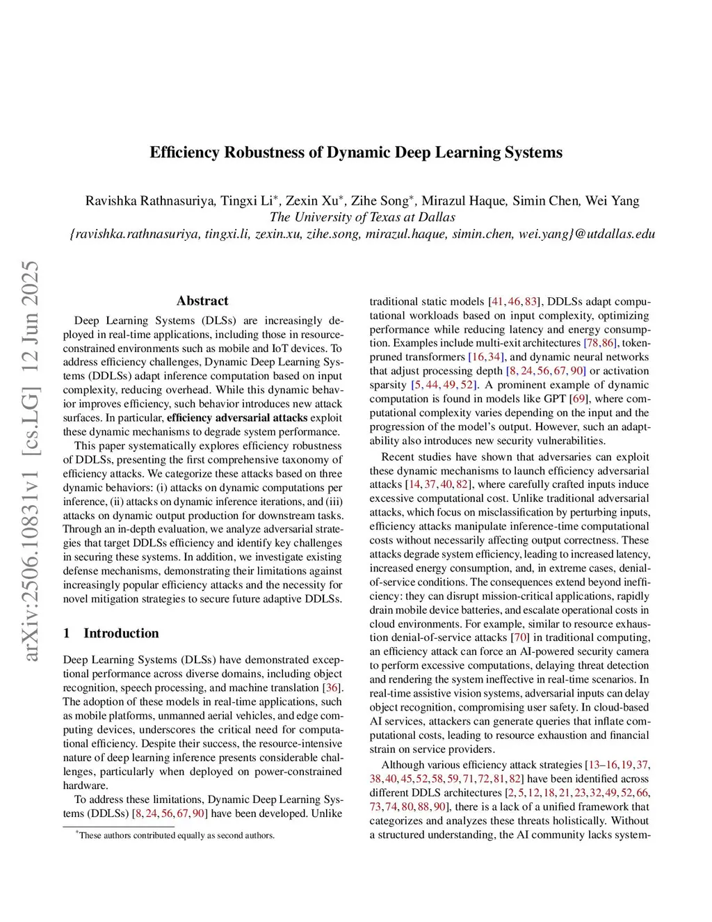 Deep Learning Systems (DLSs) are increasingly deployed in real-time applications, including those in resourceconstrained environments such as mobile and IoT devices. To address efficiency challenges, Dynamic Deep Learning Systems (DDLSs) adapt inference computation based on input complexity, reducing overhead. While this dynamic behavior improves efficiency, such behavior introduces new attack surfaces. In particular, efficiency adversarial attacks exploit these dynamic mechanisms to degrade system performance. This paper systematically explores efficiency robustness of DDLSs, presenting the first comprehensive taxonomy of efficiency attacks. We categorize these attacks based on three dynamic behaviors: (i) attacks on dynamic computations per inference, (ii) attacks on dynamic inference iterations, and (iii) attacks on dynamic output production for downstream tasks. Through an in-depth evaluation, we analyze adversarial strategies that target DDLSs efficiency and identify key challenges in securing these systems. In addition, we investigate existing defense mechanisms, demonstrating their limitations against increasingly popular efficiency attacks and the necessity for novel mitigation strategies to secure future adaptive DDLSs.
