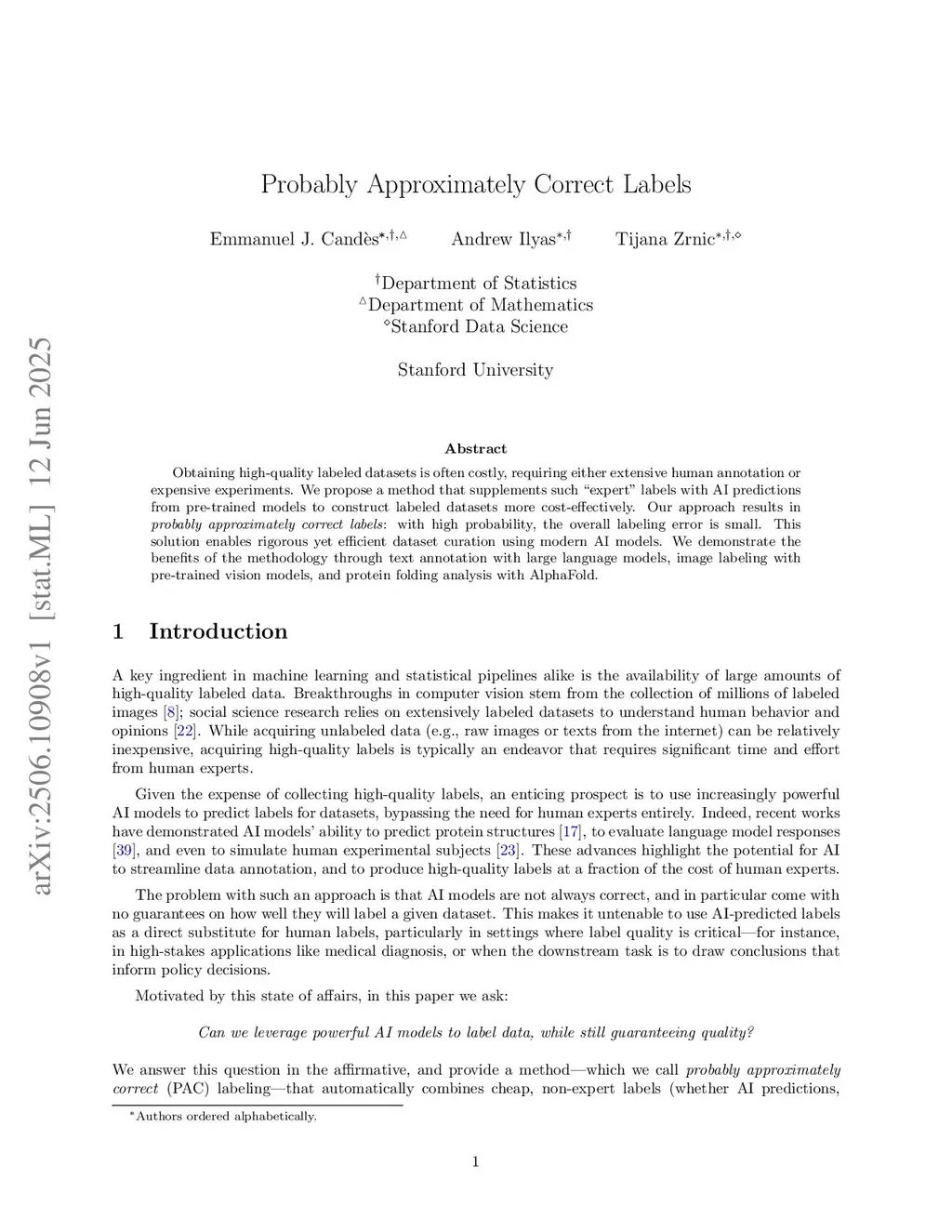 Obtaining high-quality labeled datasets is often costly, requiring either human annotation or expensive experiments. In theory, powerful pre-trained AI models provide an opportunity to automatically label datasets and save costs. Unfortunately, these models come with no guarantees on their accuracy, making wholesale replacement of manual labeling impractical. In this work, we propose a method for leveraging pre-trained AI models to curate cost-effective and high-quality datasets. In particular, our approach results in probably approximately correct labels: with high probability, the overall labeling error is small. Our method is nonasymptotically valid under minimal assumptions on the dataset or the AI model being studied, and thus enables rigorous yet efficient dataset curation using modern AI models. We demonstrate the benefits of the methodology through text annotation with large language models, image labeling with pre-trained vision models, and protein folding analysis with AlphaFold.