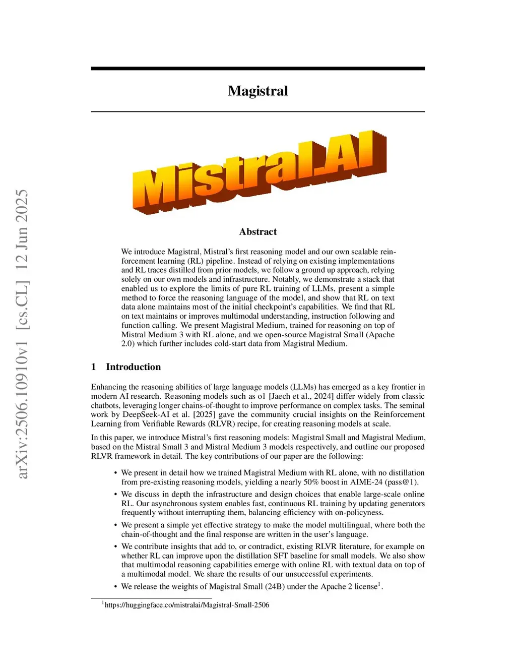 We introduce Magistral, Mistral's first reasoning model and our own scalable reinforcement learning (RL) pipeline. Instead of relying on existing implementations and RL traces distilled from prior models, we follow a ground up approach, relying solely on our own models and infrastructure. Notably, we demonstrate a stack that enabled us to explore the limits of pure RL training of LLMs, present a simple method to force the reasoning language of the model, and show that RL on text data alone maintains most of the initial checkpoint's capabilities. We find that RL on text maintains or improves multimodal understanding, instruction following and function calling. We present Magistral Medium, trained for reasoning on top of Mistral Medium 3 with RL alone, and we open-source Magistral Small (Apache 2.0) which further includes cold-start data from Magistral Medium.