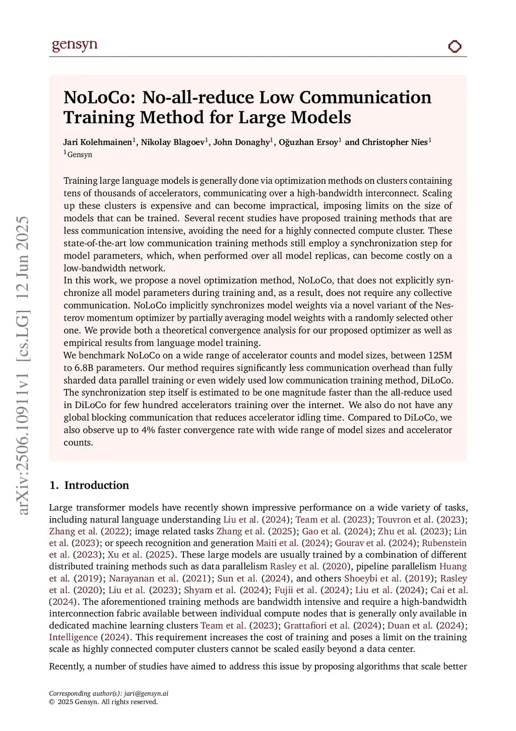 Training large language models is generally done via optimization methods on clusters containing tens of thousands of accelerators, communicating over a high-bandwidth interconnect. Scaling up these clusters is expensive and can become impractical, imposing limits on the size of models that can be trained. Several recent studies have proposed training methods that are less communication intensive, avoiding the need for a highly connected compute cluster. These state-of-the-art low communication training methods still employ a synchronization step for model parameters, which, when performed over all model replicas, can become costly on a low-bandwidth network.In this work, we propose a novel optimization method, NoLoCo, that does not explicitly synchronize all model parameters during training and, as a result, does not require any collective communication. NoLoCo implicitly synchronizes model weights via a novel variant of the Nesterov momentum optimizer by partially averaging model weights with a randomly selected other one. We provide both a theoretical convergence analysis for our proposed optimizer as well as empirical results from language model training.We benchmark NoLoCo on a wide range of accelerator counts and model sizes, between 125M to 6.8B parameters. Our method requires significantly less communication overhead than fully sharded data parallel training or even widely used low communication training method, DiLoCo. The synchronization step itself is estimated to be one magnitude faster than the all-reduce used in DiLoCo for few hundred accelerators training over the internet. We also do not have any global blocking communication that reduces accelerator idling time. Compared to DiLoCo, we also observe up to faster convergence rate with wide range of model sizes and accelerator counts.