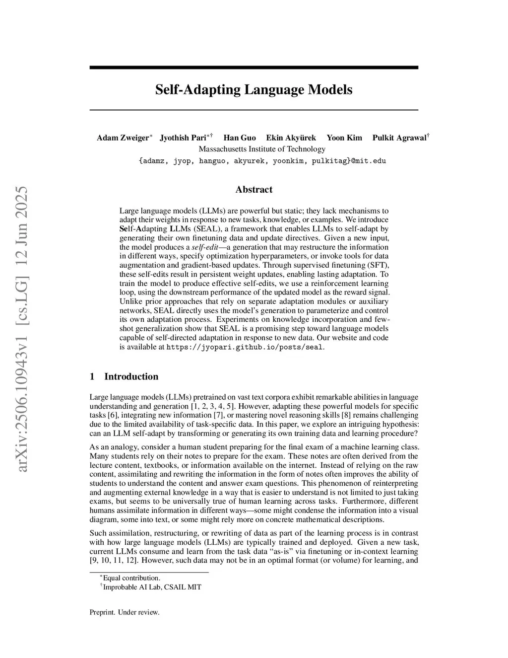 Large language models (LLMs) are powerful but static; they lack mechanisms to adapt their weights in response to new tasks, knowledge, or examples. We introduce Self-Adapting LLMs (SEAL), a framework that enables LLMs to self-adapt by generating their own finetuning data and update directives. Given a new input, the model produces a self-edit-a generation that may restructure the information in different ways, specify optimization hyperparameters, or invoke tools for data augmentation and gradient-based updates. Through supervised finetuning (SFT), these self-edits result in persistent weight updates, enabling lasting adaptation. To train the model to produce effective self-edits, we use a reinforcement learning loop with the downstream performance of the updated model as the reward signal. Unlike prior approaches that rely on separate adaptation modules or auxiliary networks, SEAL directly uses the model's own generation to control its adaptation process. Experiments on knowledge incorporation and few-shot generalization show that SEAL is a promising step toward language models capable of self-directed adaptation. Our website and code is available atthis https URL.