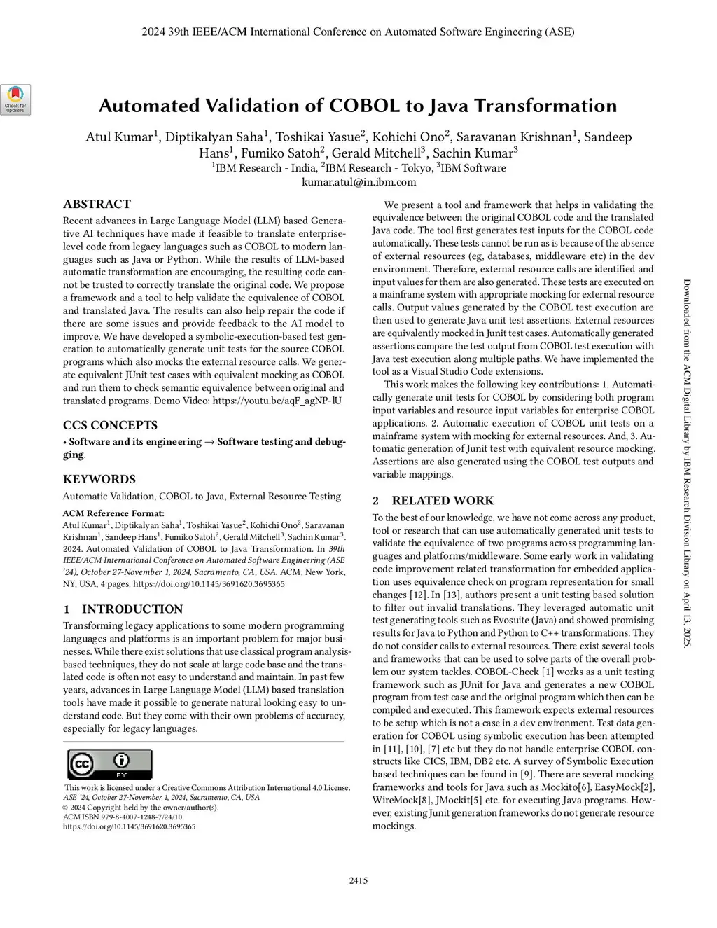 Recent advances in Large Language Model (LLM) based Generative AI techniques have made it feasible to translate enterpriselevel code from legacy languages such as COBOL to modern languages such as Java or Python. While the results of LLM-based automatic transformation are encouraging, the resulting code cannot be trusted to correctly translate the original code. We propose a framework and a tool to help validate the equivalence of COBOL and translated Java. The results can also help repair the code if there are some issues and provide feedback to the AI model to improve. We have developed a symbolic-execution-based test generation to automatically generate unit tests for the source COBOL programs which also mocks the external resource calls. We generate equivalent JUnit test cases with equivalent mocking as COBOL and run them to check semantic equivalence between original and translated programs.