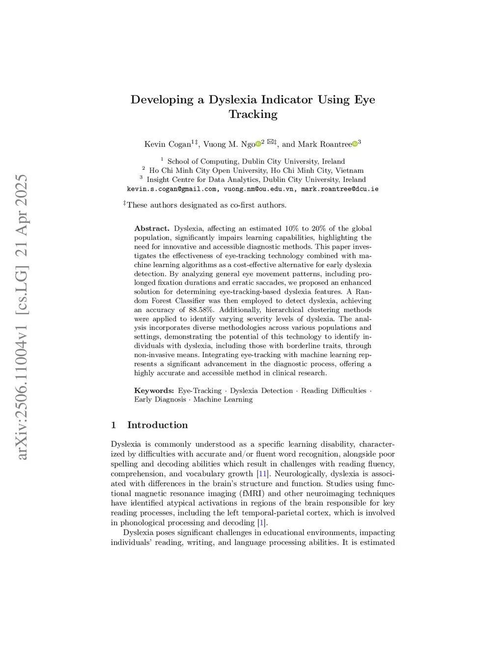 Dyslexia, affecting an estimated 10% to 20% of the global population, significantly impairs learning capabilities, highlighting the need for innovative and accessible diagnostic methods. This paper investigates the effectiveness of eye-tracking technology combined with machine learning algorithms as a cost-effective alternative for early dyslexia detection. By analyzing general eye movement patterns, including prolonged fixation durations and erratic saccades, we proposed an enhanced solution for determining eye-tracking-based dyslexia features. A Random Forest Classifier was then employed to detect dyslexia, achieving an accuracy of 88.58\%. Additionally, hierarchical clustering methods were applied to identify varying severity levels of dyslexia. The analysis incorporates diverse methodologies across various populations and settings, demonstrating the potential of this technology to identify individuals with dyslexia, including those with borderline traits, through non-invasive means. Integrating eye-tracking with machine learning represents a significant advancement in the diagnostic process, offering a highly accurate and accessible method in clinical research.
